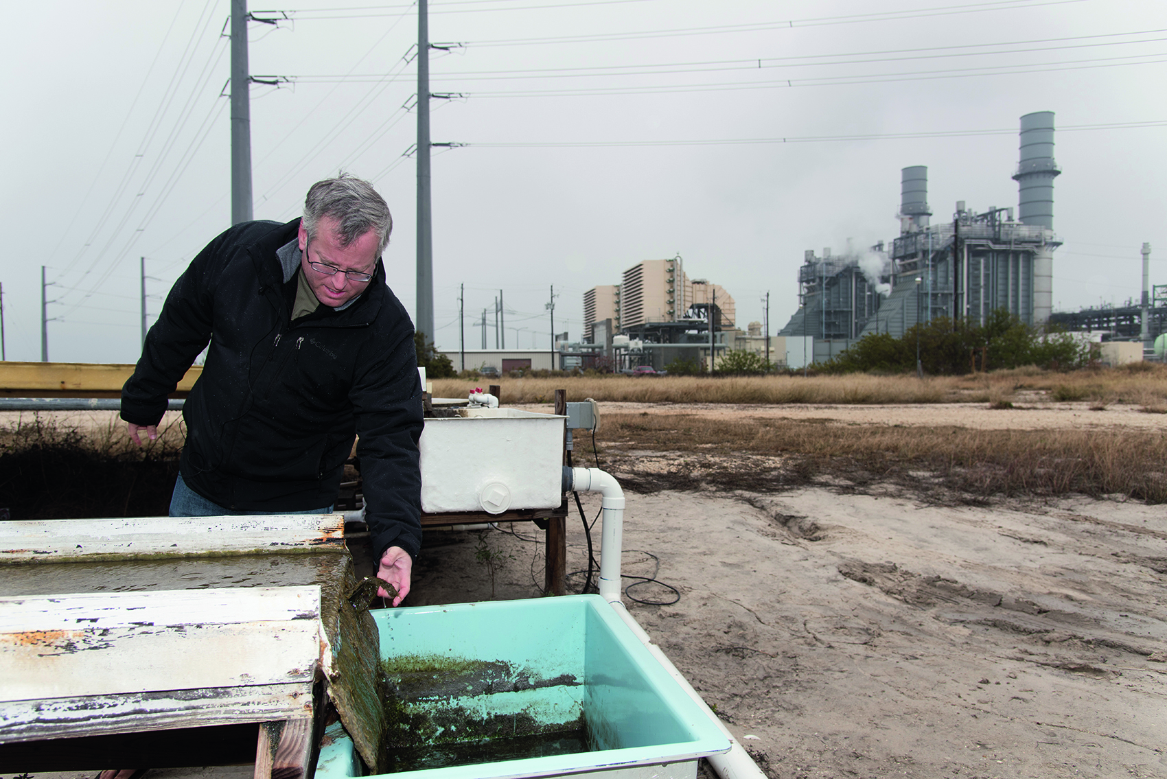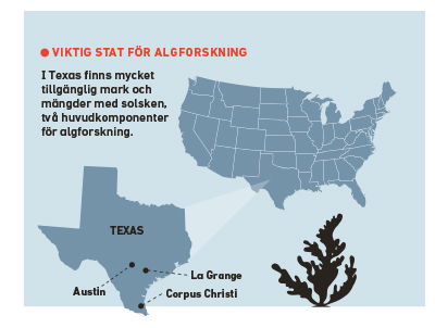 Tillbaka till Corpus Christi och forskningsstationen. På en konstruktion där havsvatten pumpas nedför en ramp växer några hinkar alger på en gammal ryamatta. I bakgrunden bolmar koldioxid från det enorma gaskraftverkets höga skorstenar. Kontrasten är en talande symbol för algers ynkliga ställning inom bränslesektorn.