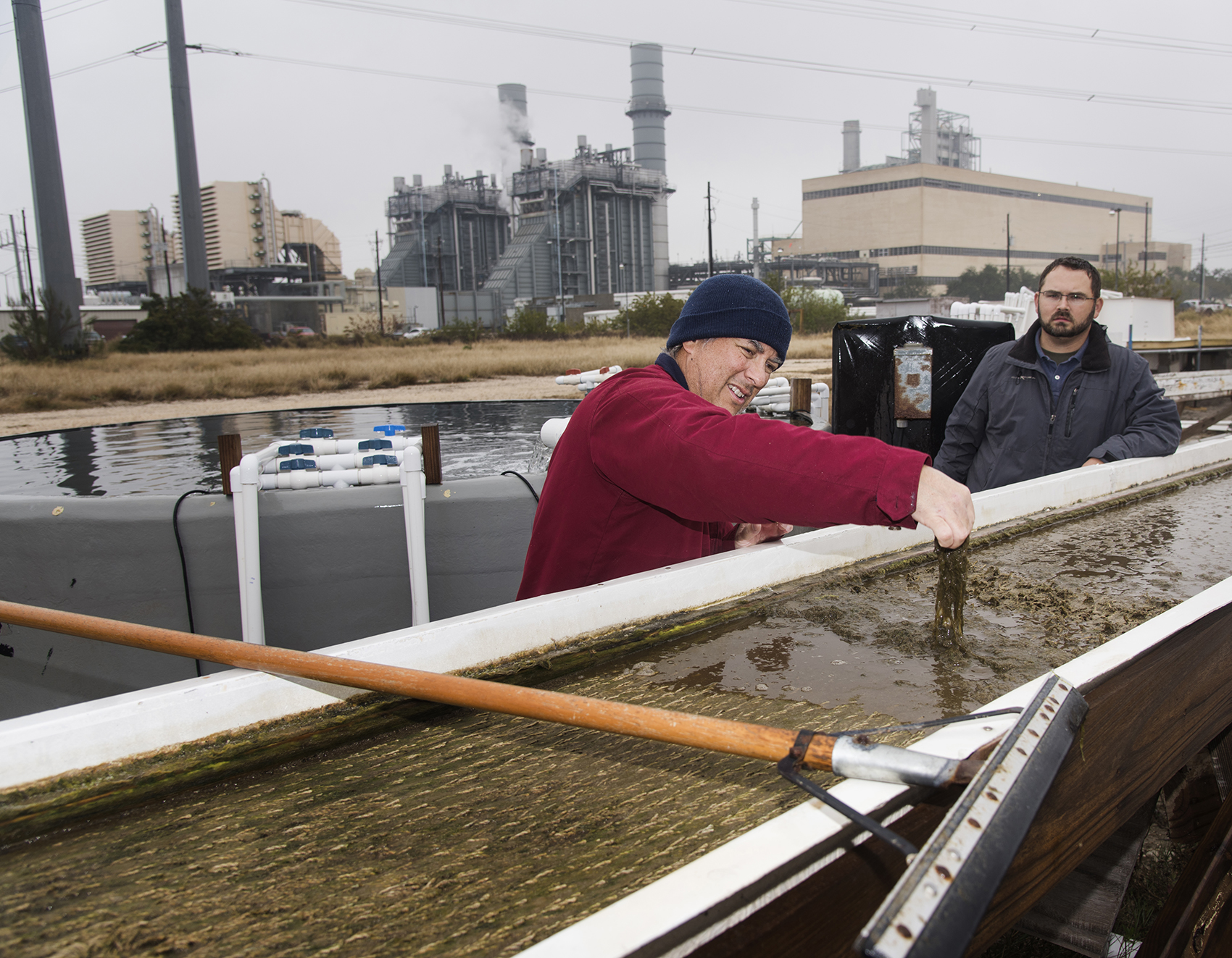 Hos Agrilife odlas algerna i en ränna med cirkulerande vatten och en typ av ryamatta. Dan Griffin och Chris Jones skördar med hjälp av en gummiskrapa.