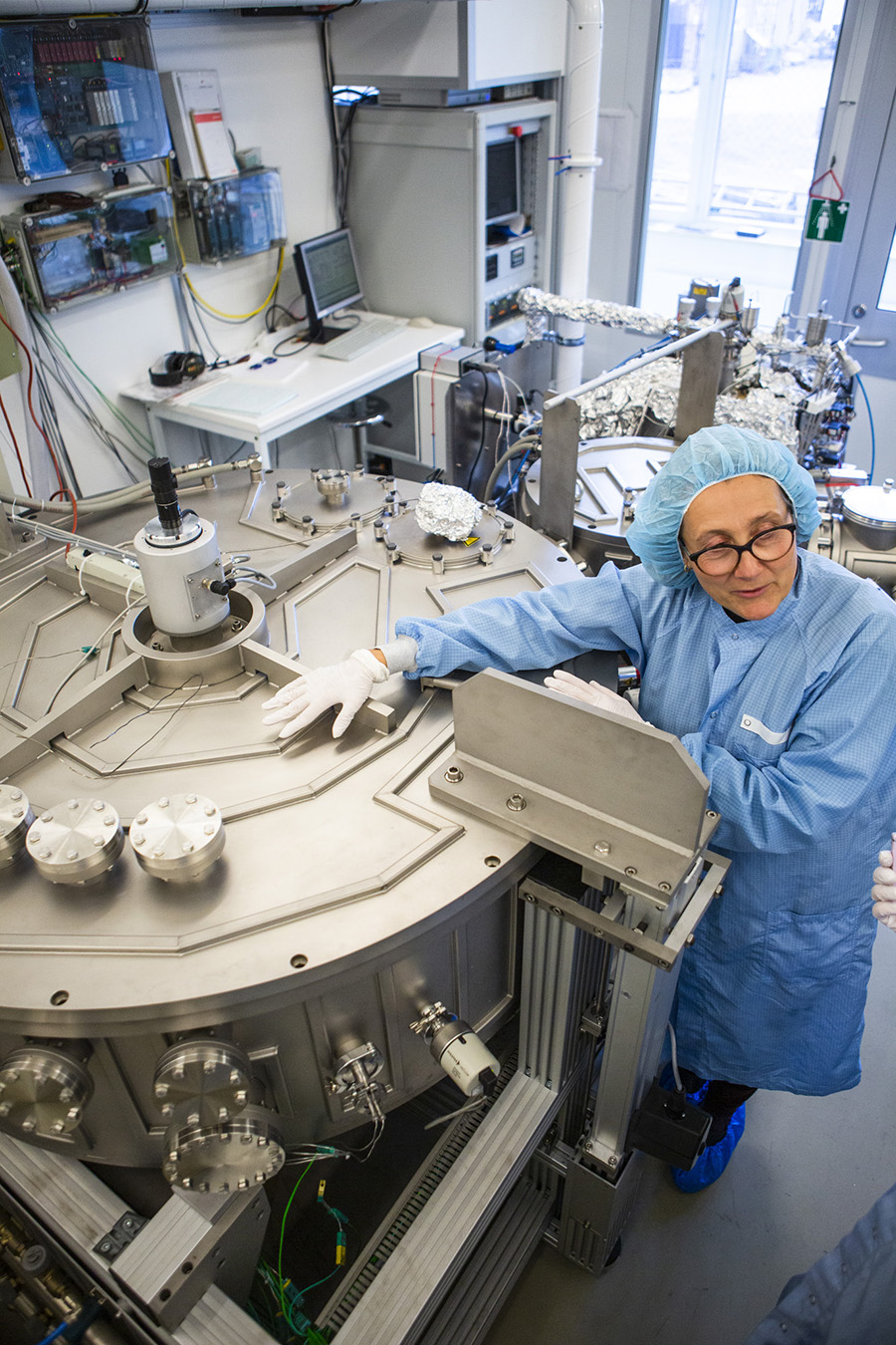 I ett hörn i ett av rummen står en maskin och dunkar. Den pumpar rent på atomnivå, så att vakuum råder när solcellerna ska tillverkas. Syreatomer eller kväve från luften får inte störa när den fina strukturen i solceller ska sättas ihop, skikt för skikt.