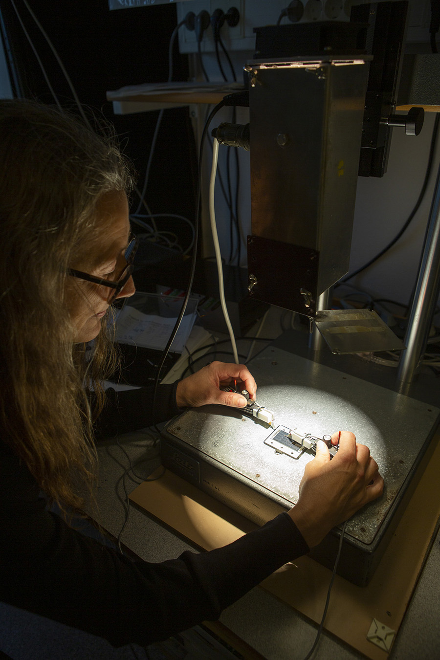 Marika Edoff placerar solceller i artificiellt solljus.