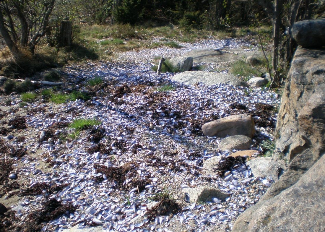 Tomma blåmusselskal uppspolade efter en massdöd av blåmusslor på 1-5 meters djup vid norra Orust. Foto: Inger Forsberg