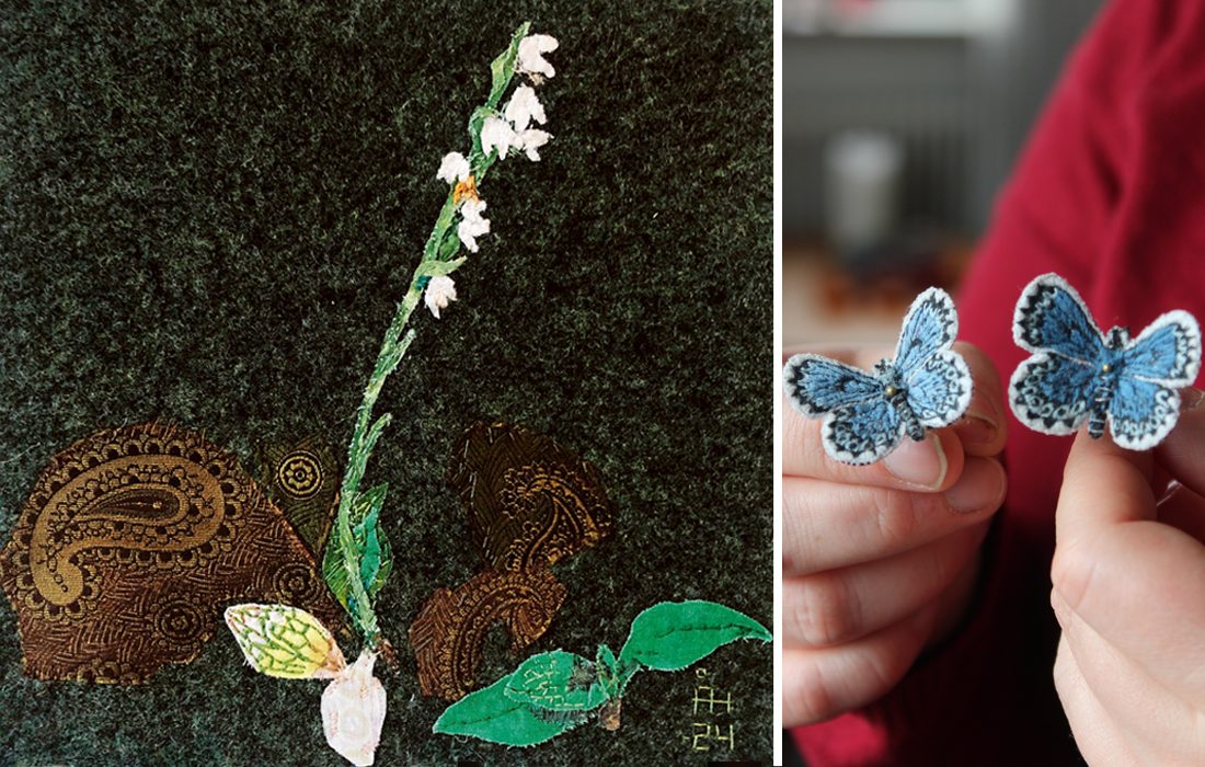 Åsa Hylén på Täcklebo broderiakademi har broderat orkidén knärot (till vänster i bild, Foto: Åsa Hylén.) Och Maria Kamfjord har broderat två fetörtsblåvingar (till höger i bild. Foto: Isabelle Strengbom.)