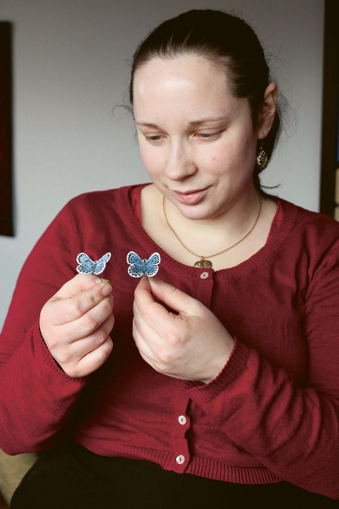 Som utbildad konstbrodös är Maria Kamfjord van vid hantverket. Men fetörtsblåvingen bjöd på flera utmaningar.
