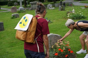 Visan hänger kvar i luften medan deltagarna, som sista anhalt, stannar till vid Bert Bolins klätterbenved-, pelargon- och kärleksörtsbeklädda gravsten.