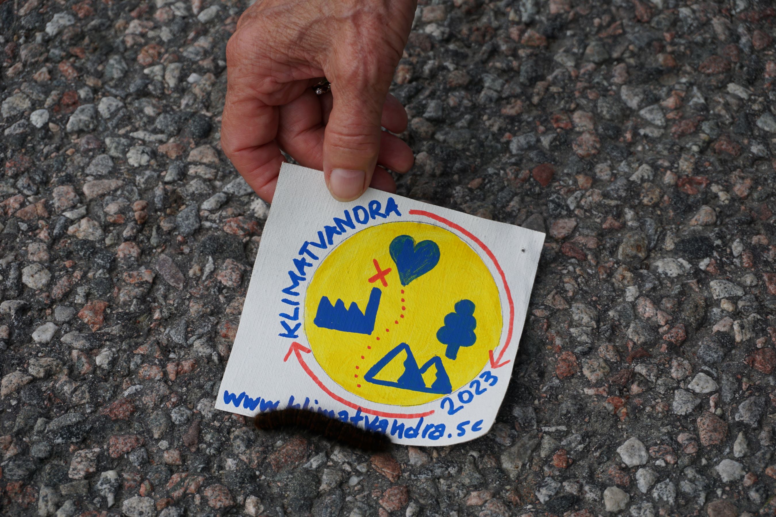 En fjärilslarv på vift ute på en landsväg plockas varsamt upp med hjälp av initiativets logga. Foto: Olof Östman