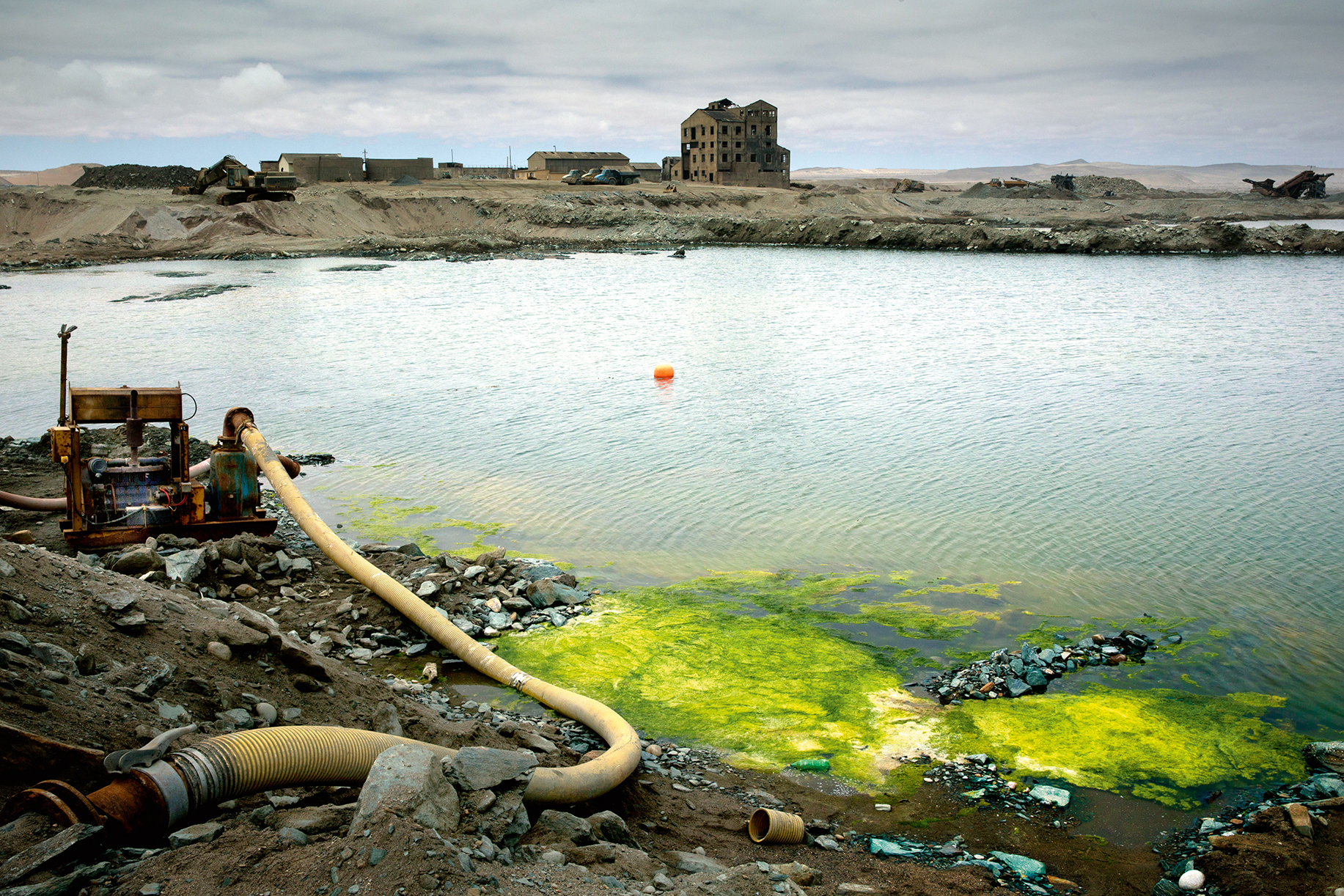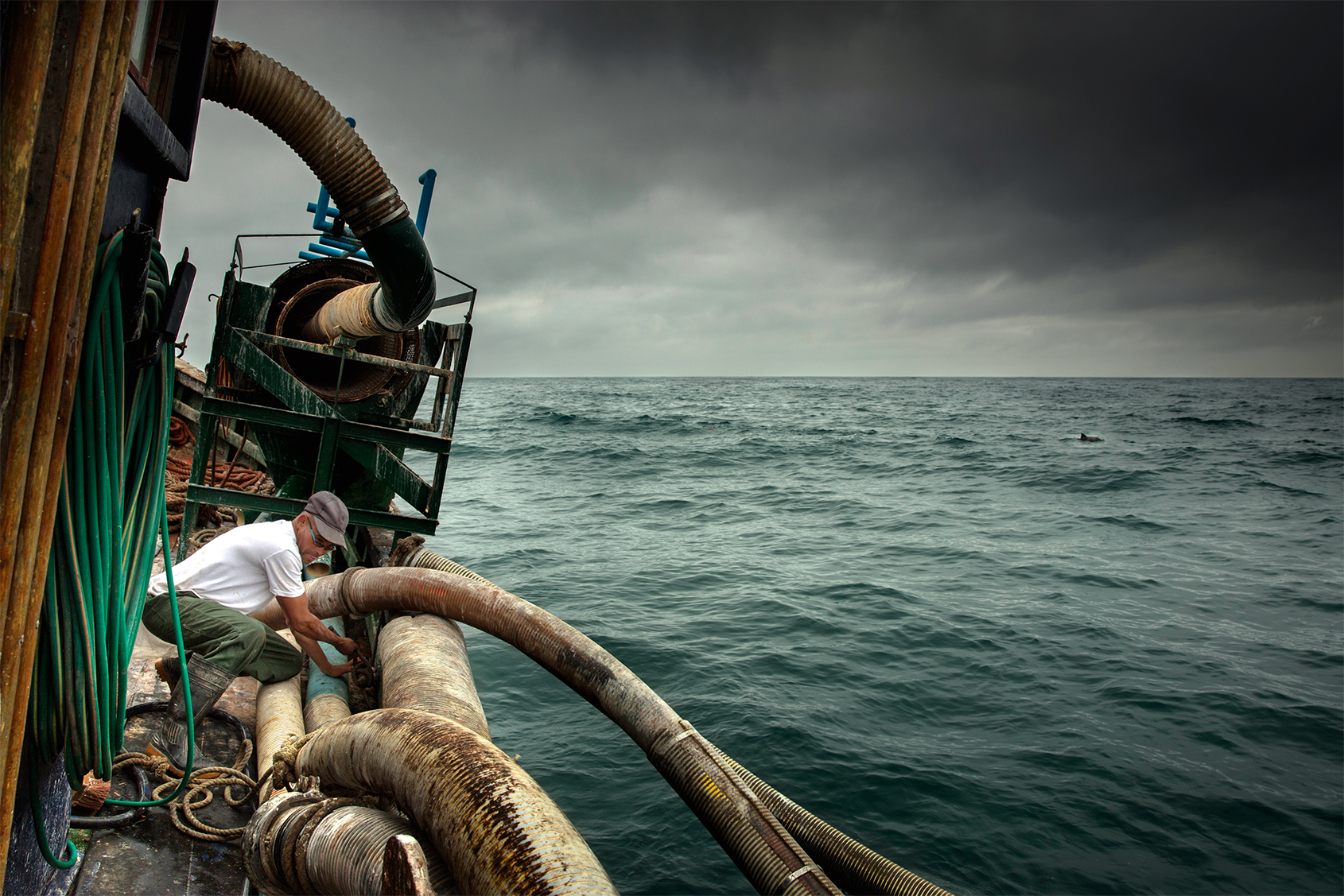 De artificiella dammarna ser postapokalyptiska ut. Tjocka slangar leder ner i bassängernas grumliga vatten, bulldozers står parkerade längs kanterna. Vågorna bryter vildsint mot barriären.