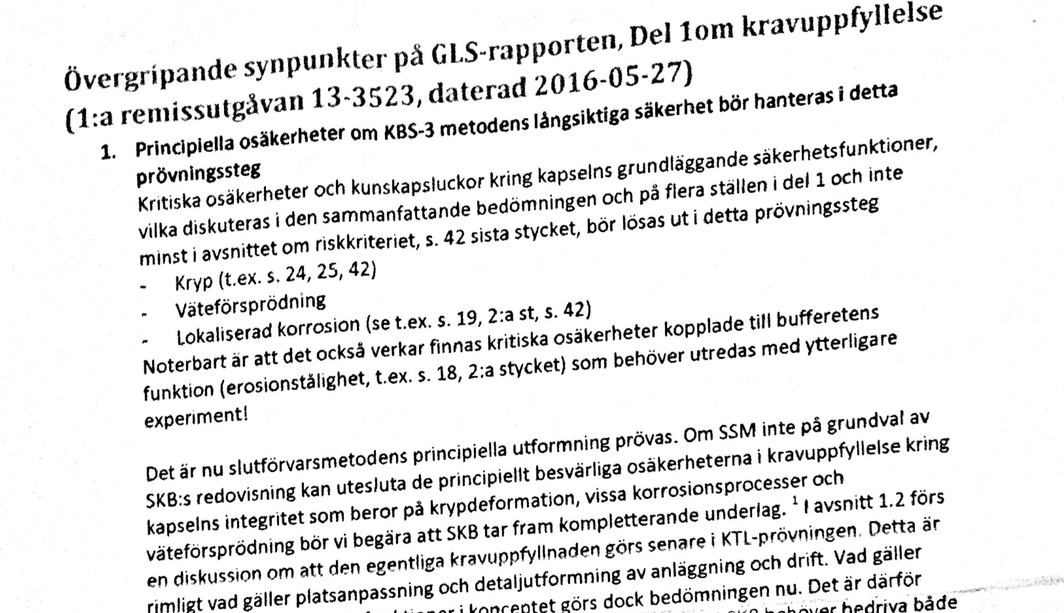 Dokumentet som tidningen nu fått tillgång till visar att risken för kapselbrott inom något hundratal år är så avgörande att det borde ha hindrat ett godkännande utan ytterligare utredning. Det skriver myndighetens specialist med ansvar för granskningen av slutförvarets långsiktiga säkerhet Björn Dverstorp i en inlaga daterad 13 juni 2016. Skrivelsen är en del av det samråd med olika experter som gjordes en innan det slutgiltiga yttrandet lämnades in till Mark- och miljödomstolen.