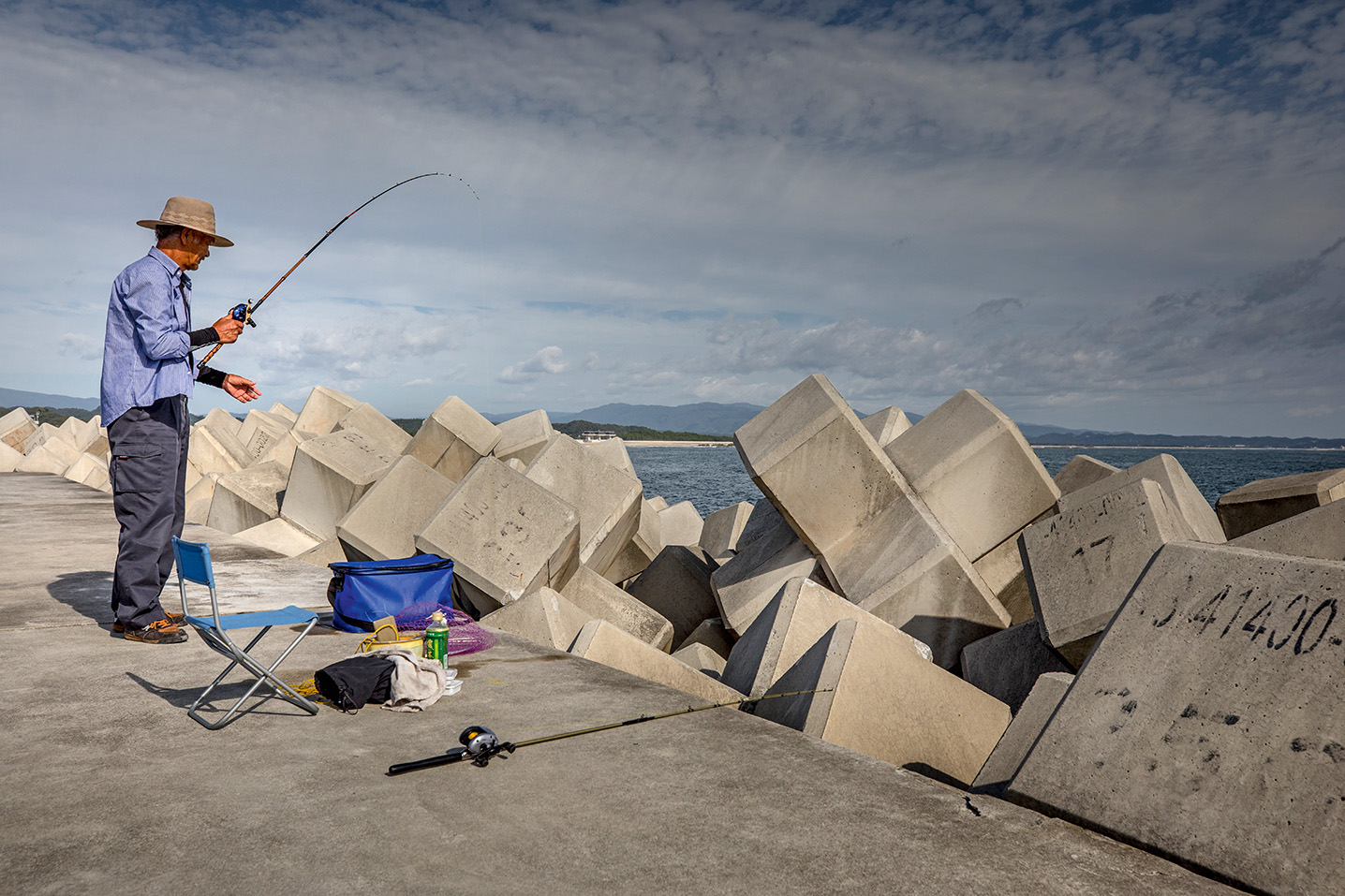 Shigeru Kawada fiskar från den nybyggda tsunamimuren vid hamnen Numanouchi.