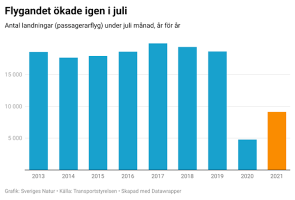 Under juni och juli ökade flygande till och från svenska flygplatser, efter att i princip stått stilla det senaste året. Under juli, som normalt brukar en månad med mindre flygtrafik än vanligt, landade fler passagerarflygplan på svenska flygplatser än någon tidigare månad under pandemin, drygt 9 000. Därmed har antalet landningar ökat till omkring hälften av vad de var före pandemins utbrott.