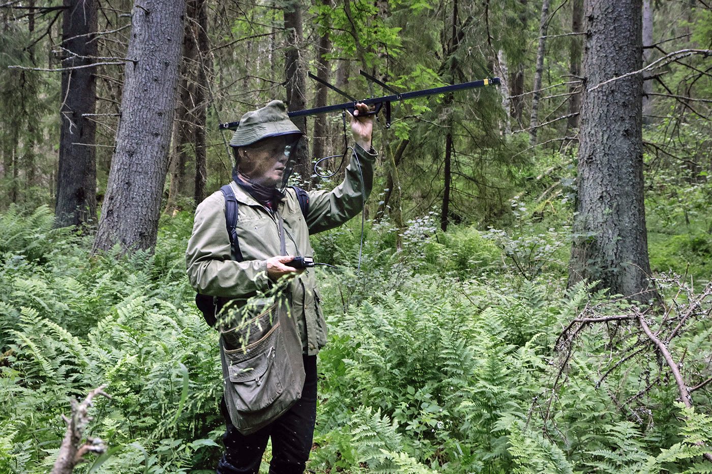 Ett blippande ljud avslöjar att en sändarmärkt flygekorre är nära. Medan Ralf Wistbacka går mellan sina holkar passar han på att hålla kolla på fler individer.