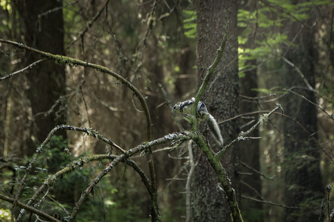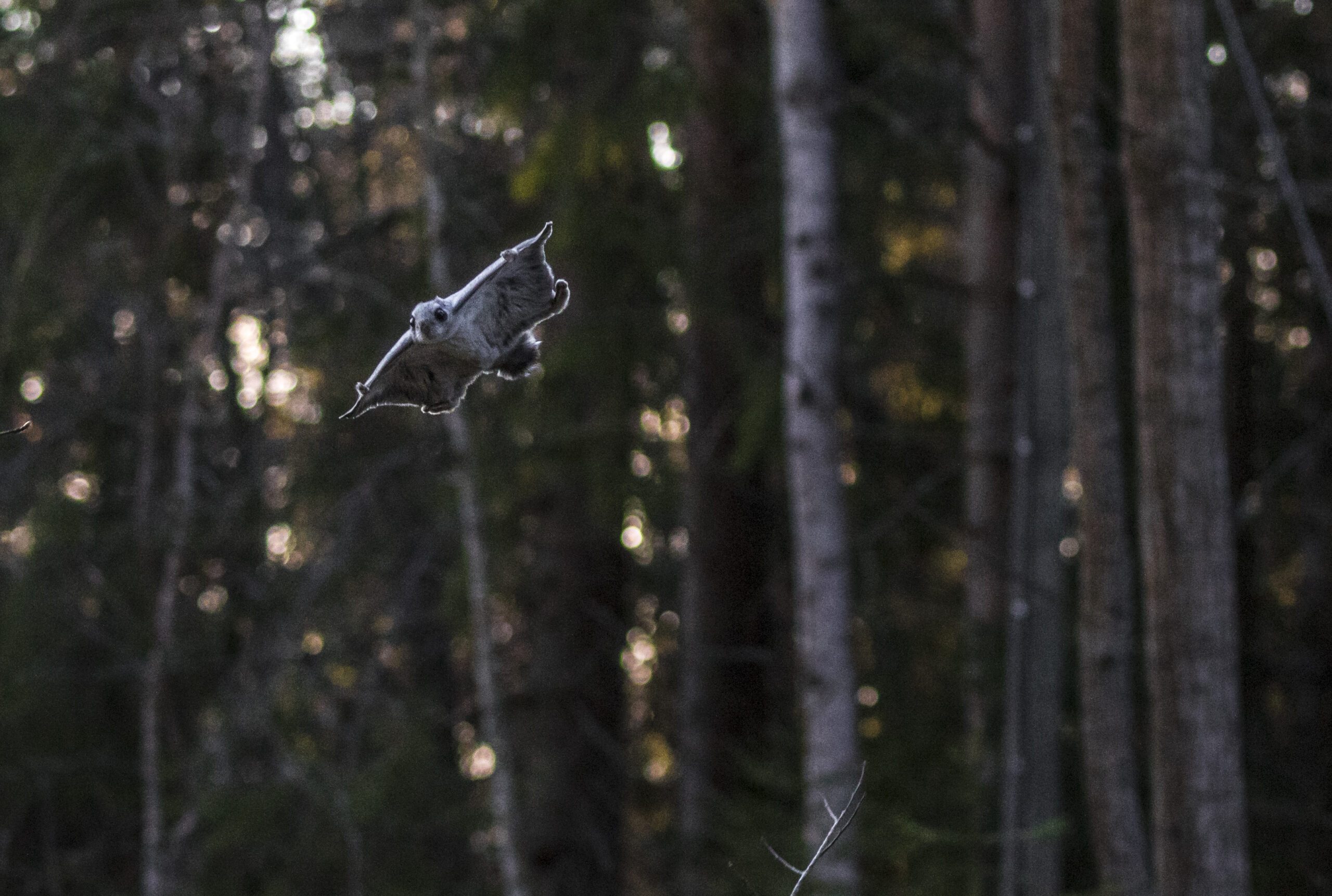 För att vara dräktig rör den sig häpnadsväckande snabbt. Flygekorren studsar fram över ett liggande mossbevuxet träd, klänger upp på en gren, kastar sig med utspänd flyghud, glider några meter och försvinner in i en tät gran. Som mest kan de glidflyga 70 meter, men då måste de starta i toppen av ett högt träd.