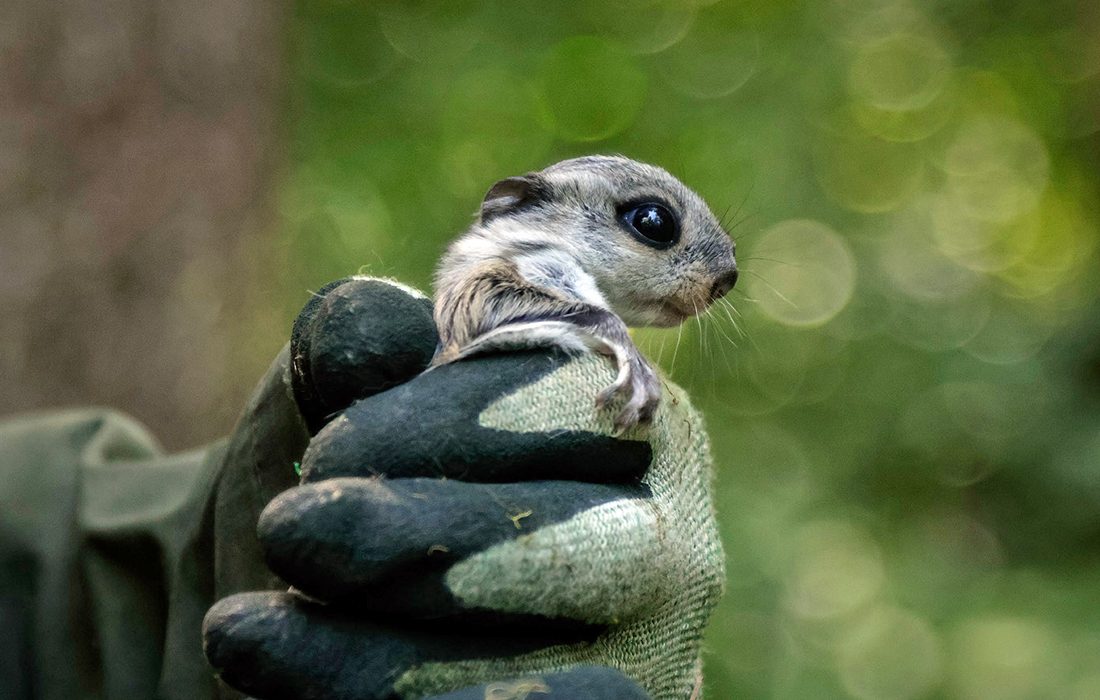 Med några snabba tångrörelser får ungen ett förgyllt örhänge med nummer 8535. Ralf Wistbacka har för sin forsknings skull öronmärkt flygekorrar sedan 1992. Våren 2023 doktorerade han vid Uleåborgs universitet med en avhandling om skogsbrukets påverkan på flygekorrar.