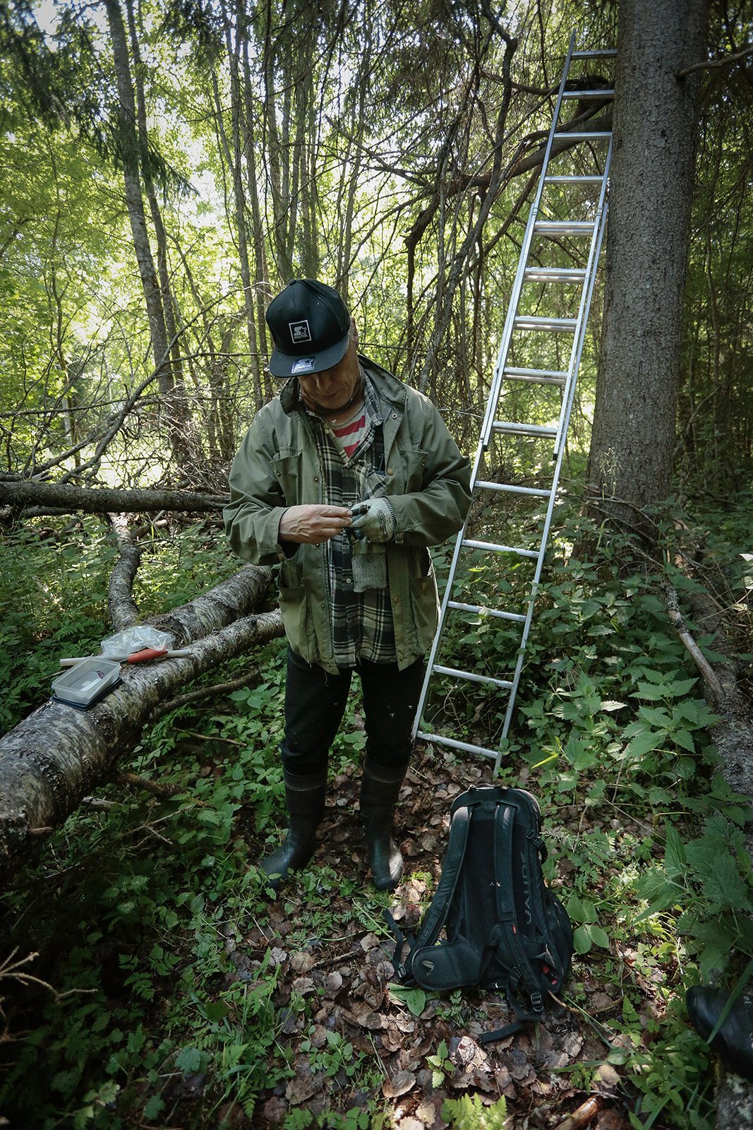 Han lyser ner i den med en ficklampa som sitter fastsurrad med tejp på ett skohorn. Han förklarar att skohornet är till för att lyfta undan skägglavstaket som flygekorrarna bygger inne i holken.