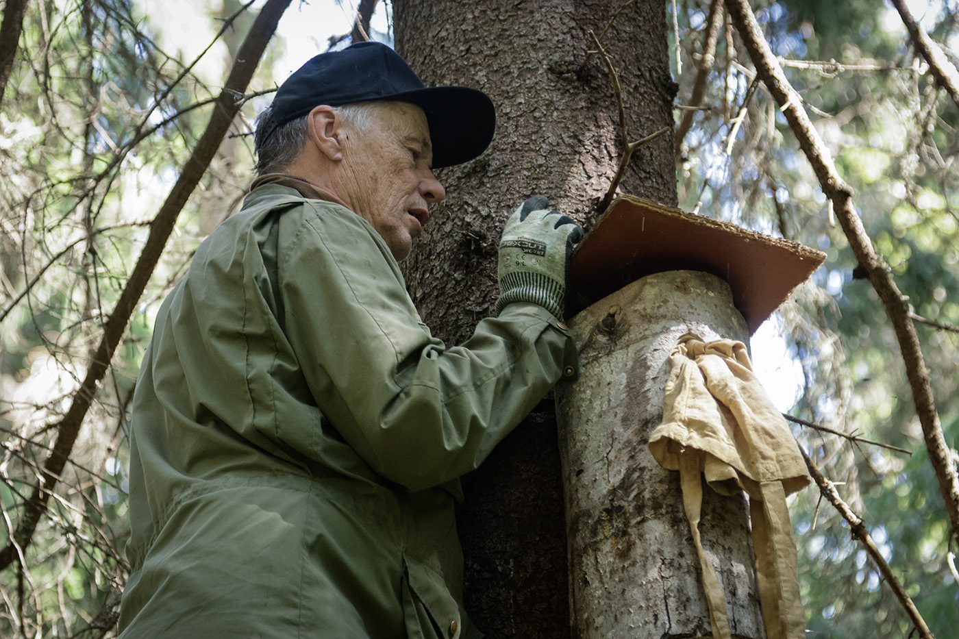 Ralf Wistbacka inspekterar en holk där flygekorrar har gjort ett bo.