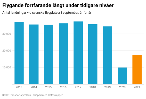I den senaste flygstatistiken från Transportstyrelsen ökar antalet flighter mellan augusti och september något, samtidigt som antalet passagerare minskar. Det är i linje med hur det brukat se ut i september månad under åren närmast före pandemin. Totalt gjordes omkring 1,3 miljoner resor under september, att jämföra med de drygt 3 miljoner som varit väntat utan pandemi, om de senaste årens sakta nedåtgående trend hade stått sig.