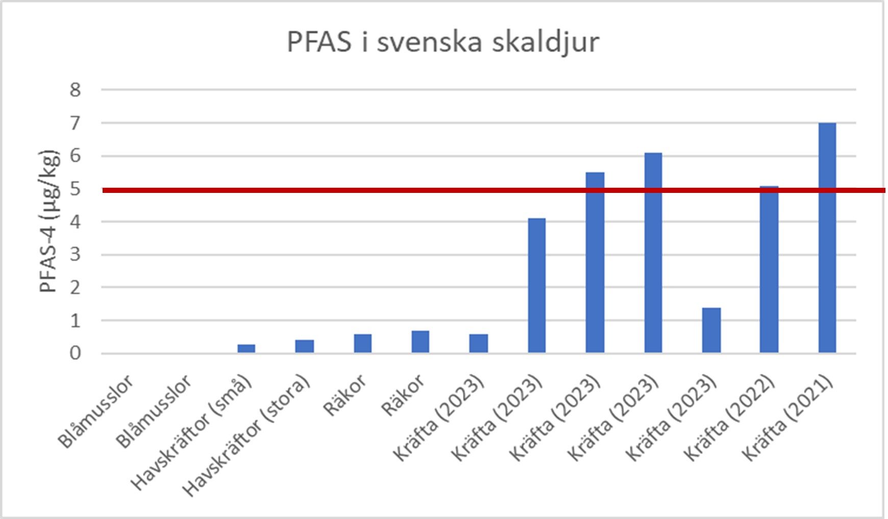 Naturskyddsföreningen har låtit analysera blåmusslor, havskräftor, räkor och kräftor. Kräftorna är signalkräftor från svenska insjöar och det är de som sticker ut i testerna. I fyra av sju paket är halterna PFAS högre än vad gränsvärdet tillåter, med ett resultat på mellan 5,1 och 7,0 mikrogram PFAS per kilo. PFAS-nivåerna i de andra testade livsmedlen ligger under gränsvärdet (se tabell i faktarutan).