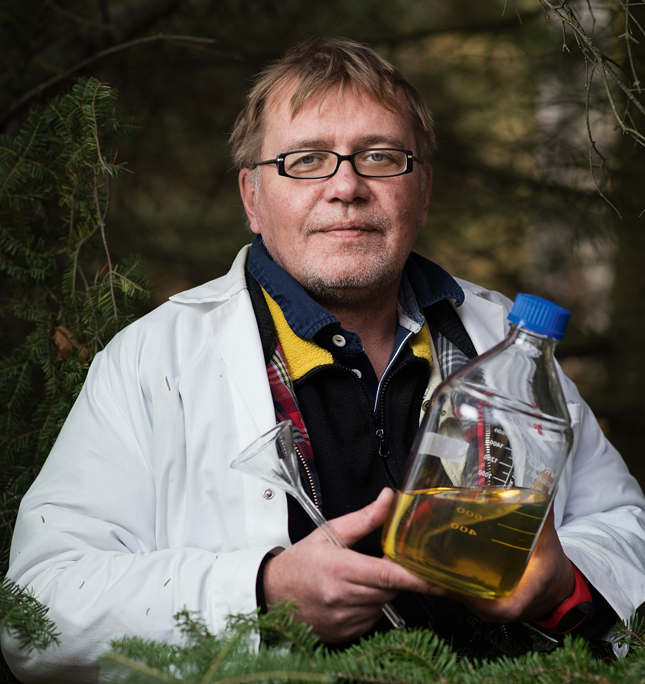 Kemiprofessor Jyri-Pekka Mikkola och en flaska grön bensin.