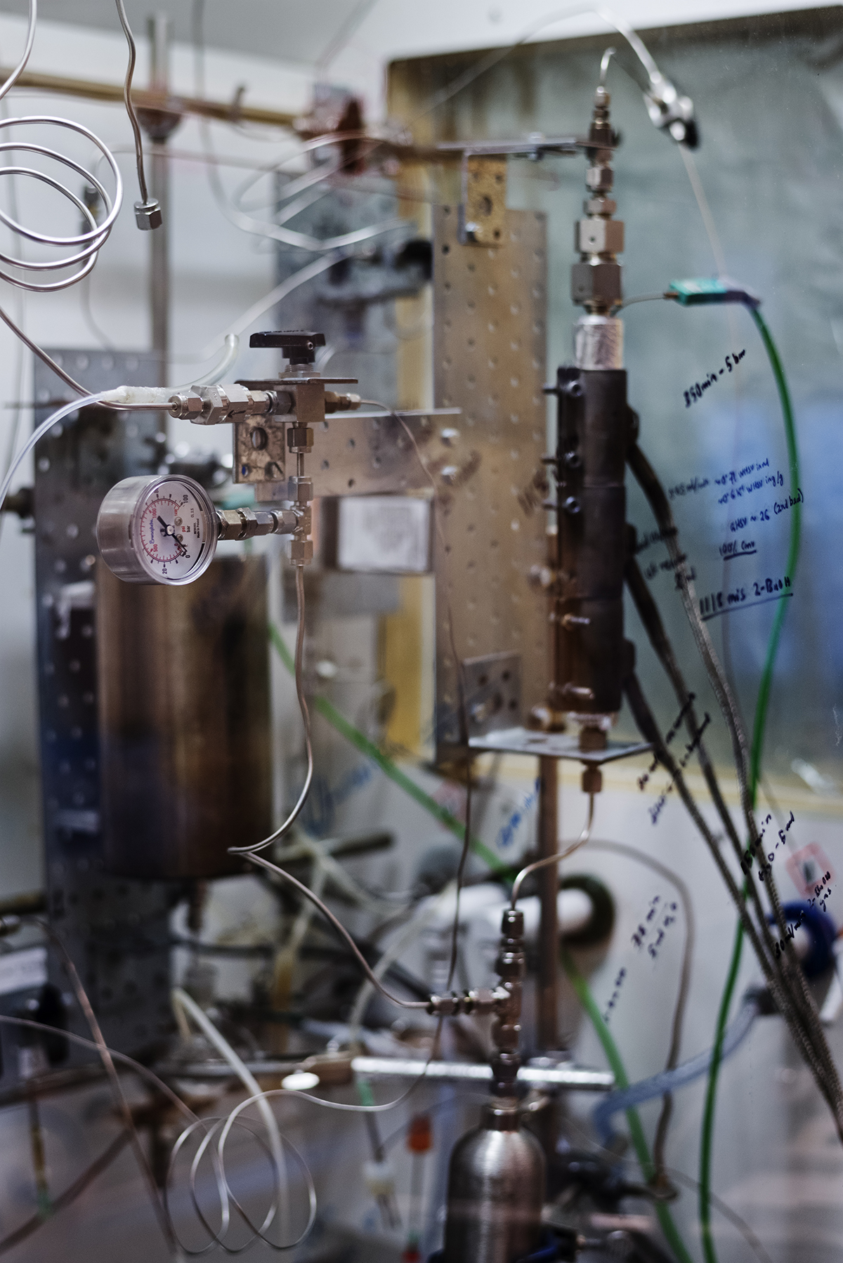 En miniatyr av en pilotanläggning för biobensin står i ett labb på Umeå Universitet.