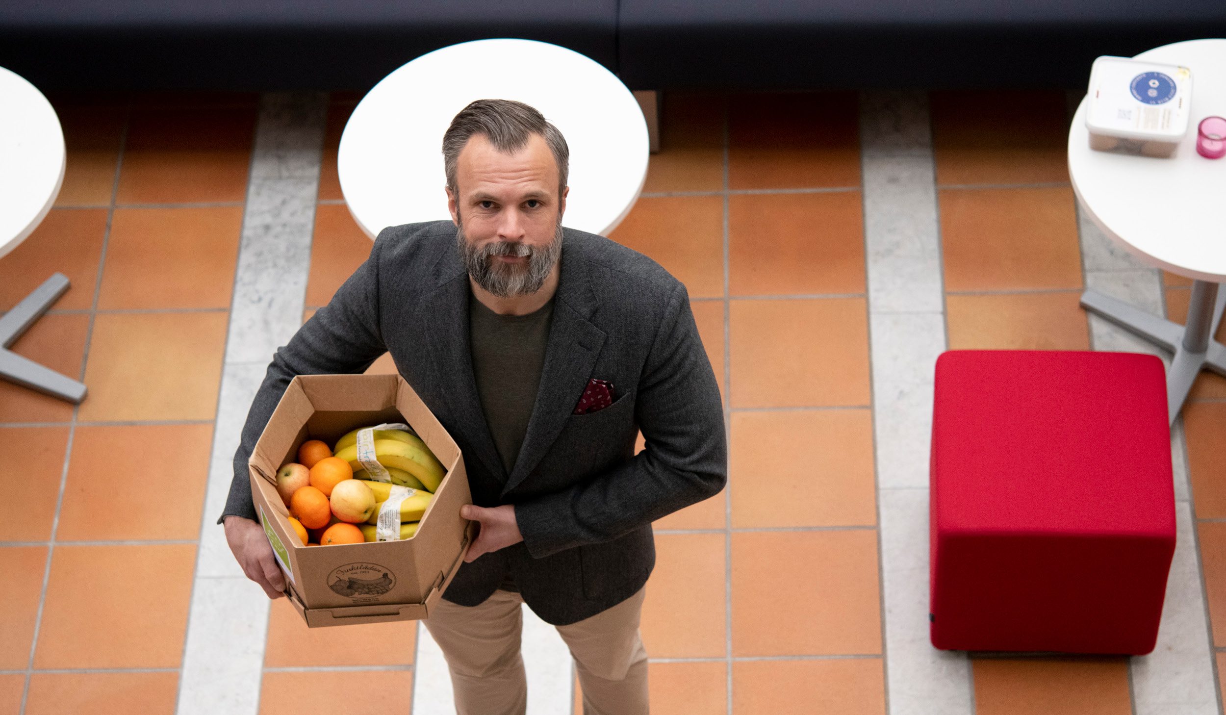 Samuel Wetter kör ibland ut ekologisk frukt till Karlstad kommun i elbil.