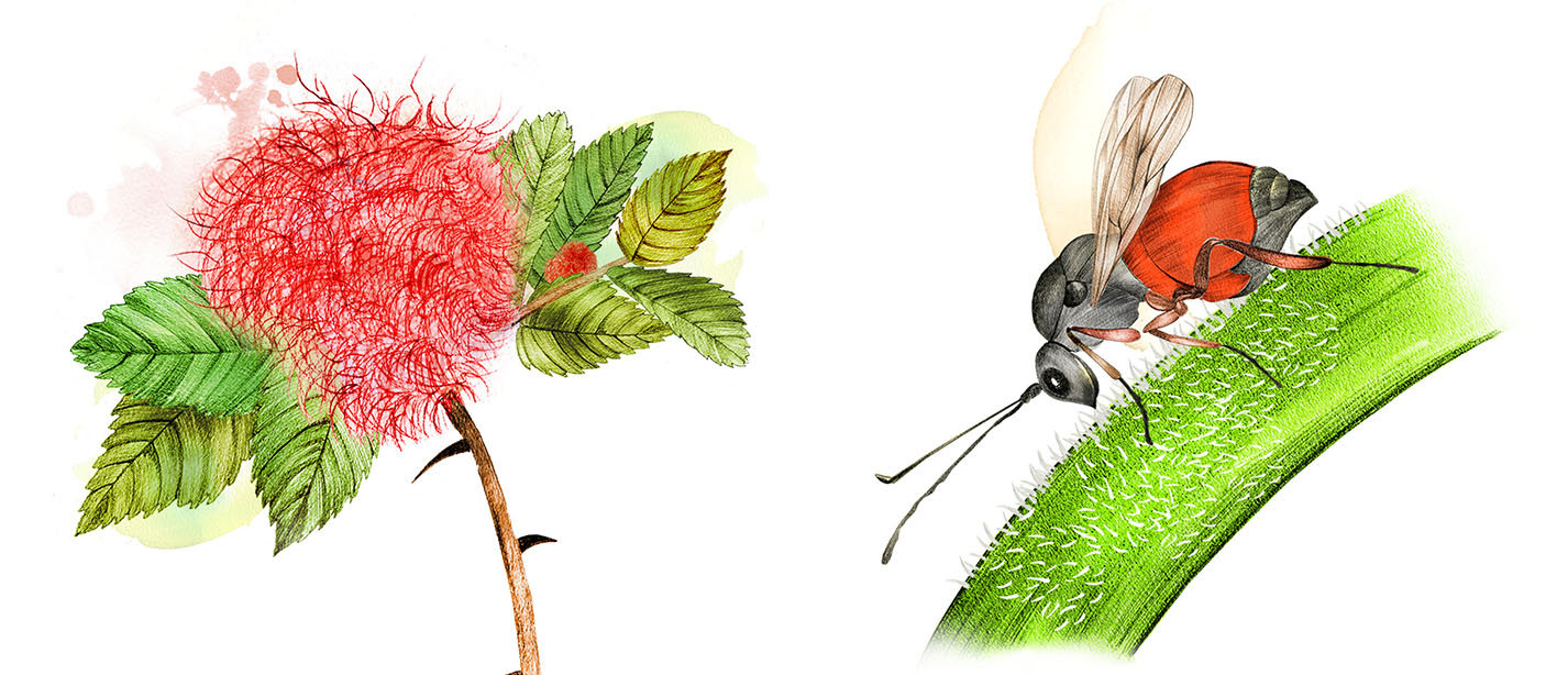 Själva gallbildarna lever ett anonymt liv och syns sällan till, men den som har skarpa ögon kan till exempel få se en hona av sömntornsstekel om våren. Som en rödsvart minigeting, knappt en halv centimeter lång, flyger hon omkring i rosenbuskar för att hitta en bra blomknopp. Stekeln lirkar in sitt äggläggningsrör mellan knoppens blad och börjar lägga ägg, blickstilla i flera timmar. Vad som händer sedan kan ingen riktigt förklara, men ämnen från honan, äggen eller larven kidnappar buskens biokemiska maskineri och tvingar den att bilda en larvkammare istället för en vanlig knopp. Därinne lever larverna ett tryggt och ombonat liv tills de kläcks nästa vår.