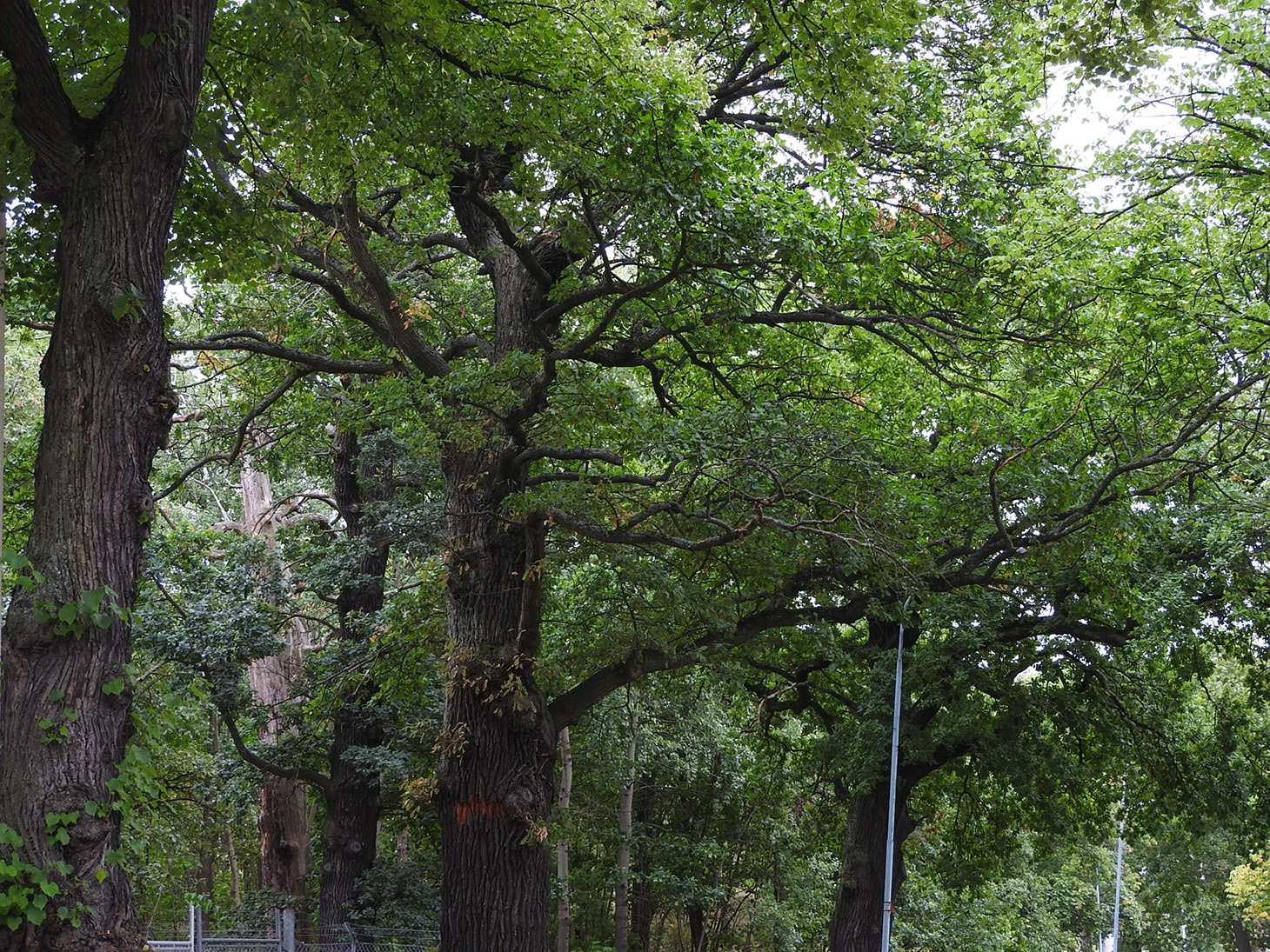 Vi står vid en av bjässarna med en omkrets på över tre och en halv meter. Trafiken på Essingeleden brusar strax intill och vid den lilla stigen genom skogspartiet har någon byggt en koja. En väg och ett mindre kontorshus skiljer ekarna från den övriga slottsparken.