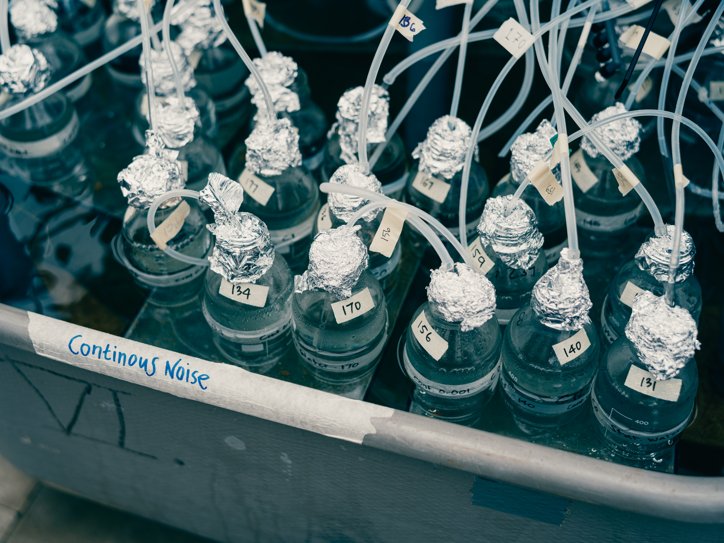 I ett växthus vid kajen finns tre stora kar fyllda av flaskor med 300 torskägg i varje, och ett virrvarr av slangar. Ett kar utsätts för ljud som påminner om fartyg, ett annat för oregelbundet buller och i det tredje är det tyst. Flaskorna innehåller skrubbervatten från fartyg i låga koncentrationer (1 och 0,001 procent) eller rent vatten.