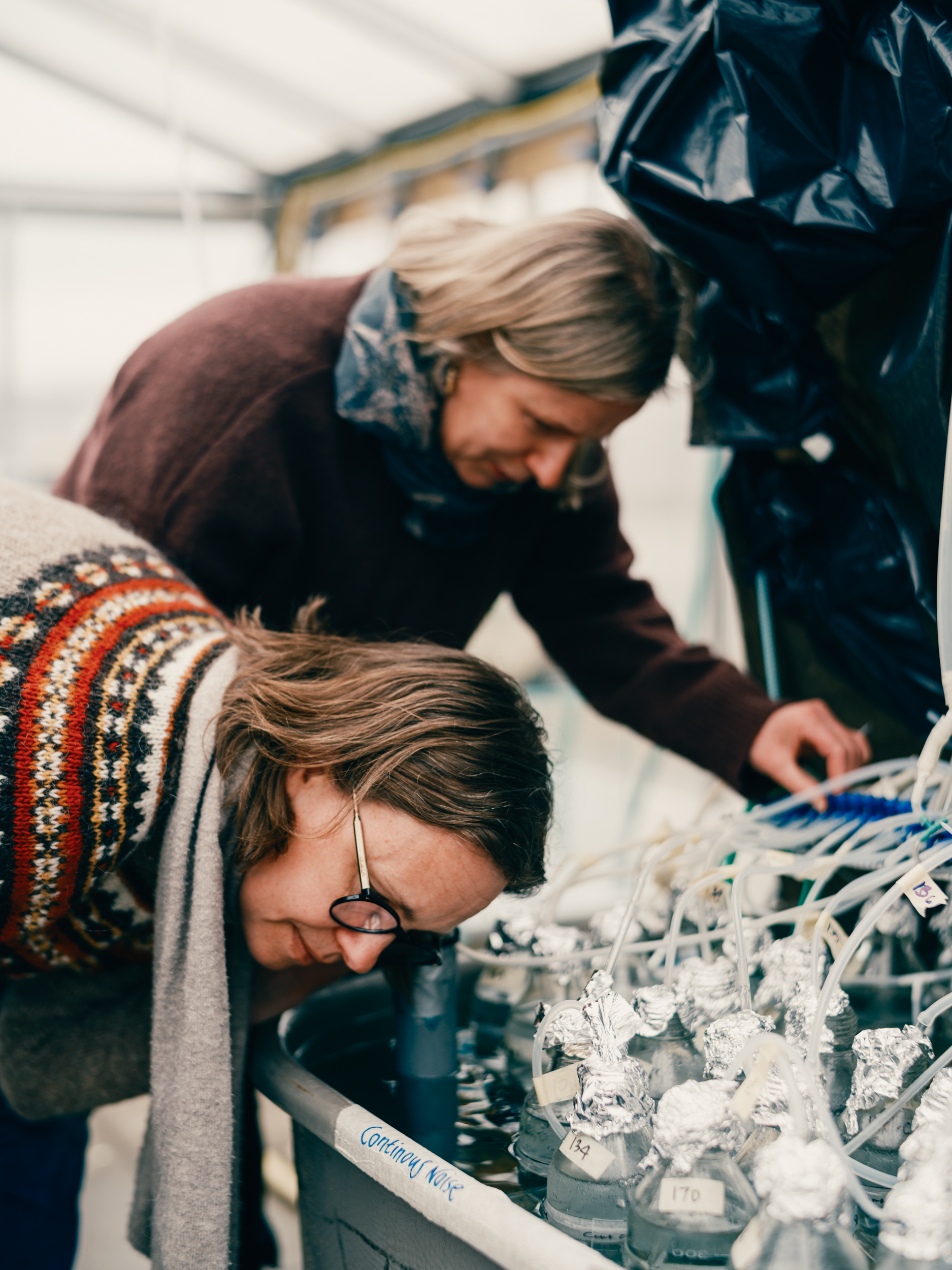 Marinbiologen Carrie Chau Yu-Chen vid IVL och Edith Aspelin, mastersstudent vid SLU vilt, fisk och miljö, håller koll på utveckling och dödlighet i flaskorna.