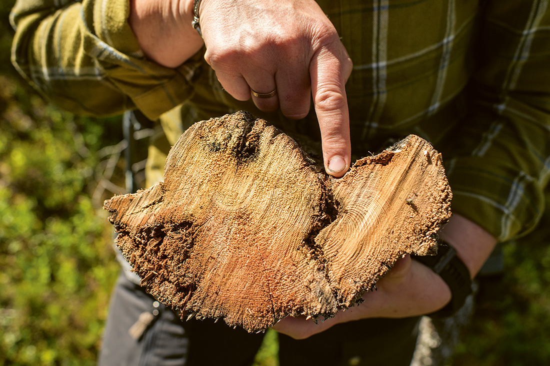 Redan några meter in i skogen ser vi den första stubben med tydliga spår av en skogsbrand.