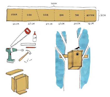 Använd gärna obehandlat virke. En ojämn yta gör det lättare förde inneboende att ta sig in och ut. Med måtten i illustrationen blir holken lagom stor för småfåglar. Klicka på bilden för att förstora den.