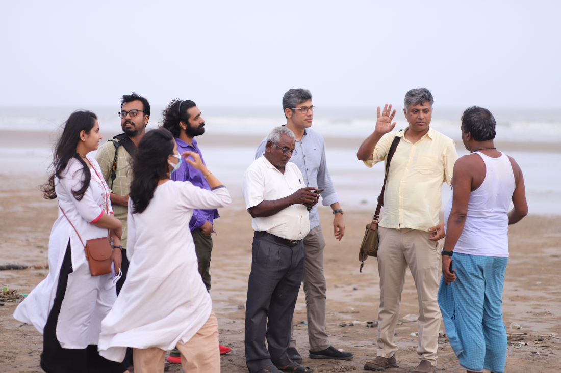 Ritwick Dutta och Rahul Choudhary interagerar med fiskare på Mandarmani-stranden som ligger i delstaten Västbengalen, Indien. Foto: Right Livelihood/Ankit Kumar