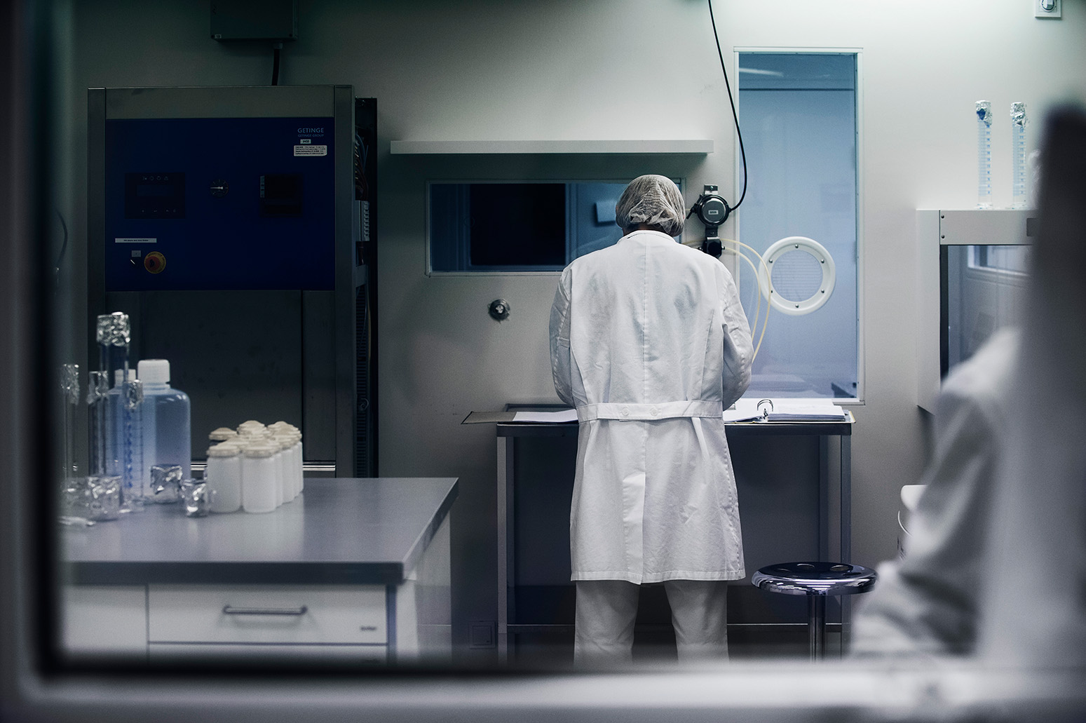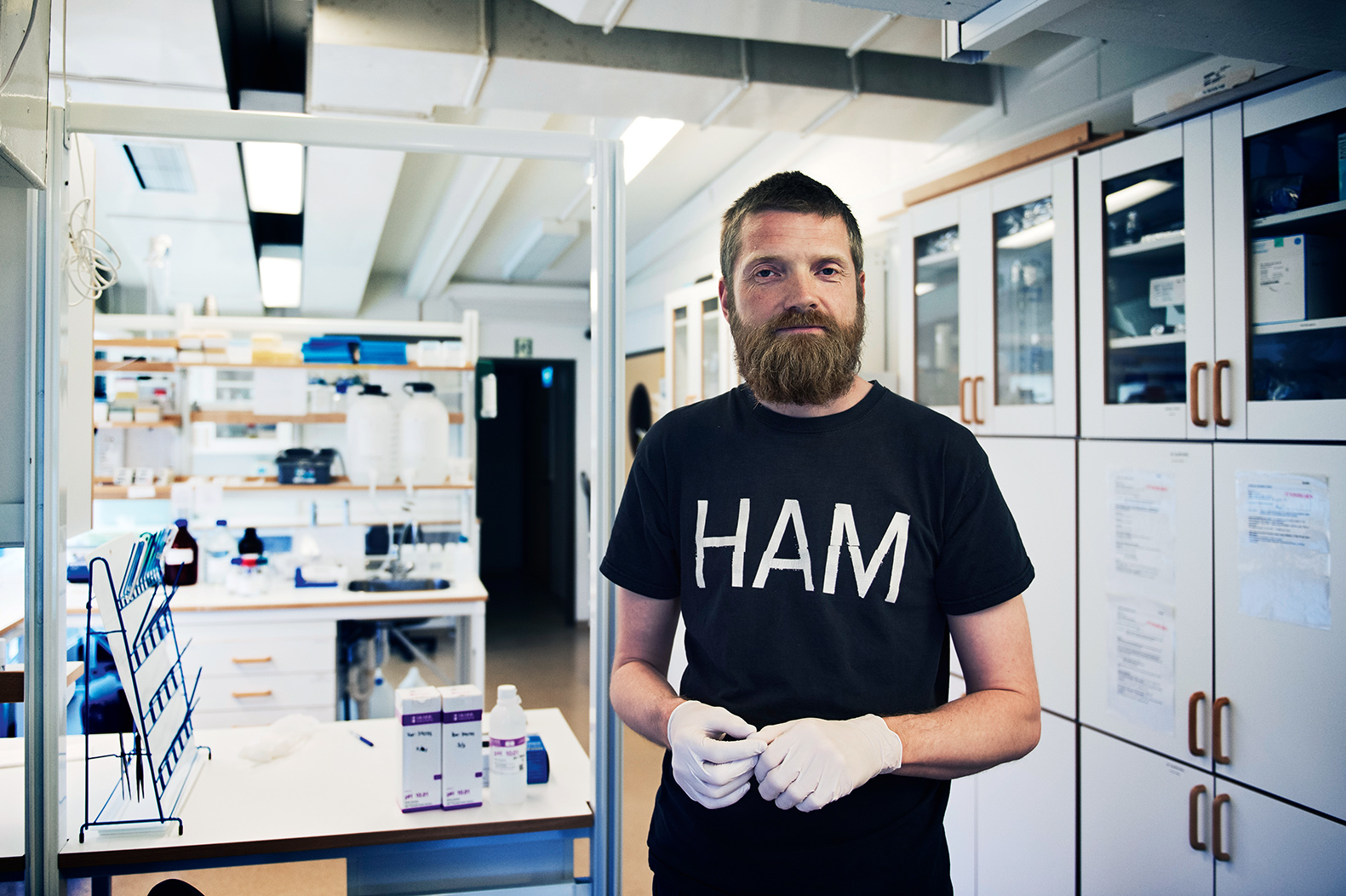 Genom ett fönster syns två personer iklädda vita rockar och hårnät arbeta i ett avskärmat rum. Bakom glasrutor står otaliga glasbägare och laboratorieglas, sterila kolvar och mätcylindrar förslutna med aluminiumfolie. Det enda som tyder på att hästar är inblandade är en affisch med den isländska hästen och dess färger. Den satte Arnþór Guðlaugsson upp på en dörr till labbet när han, som inte är uppvuxen med hästar, ville lära sig islandshästens färgteckning.