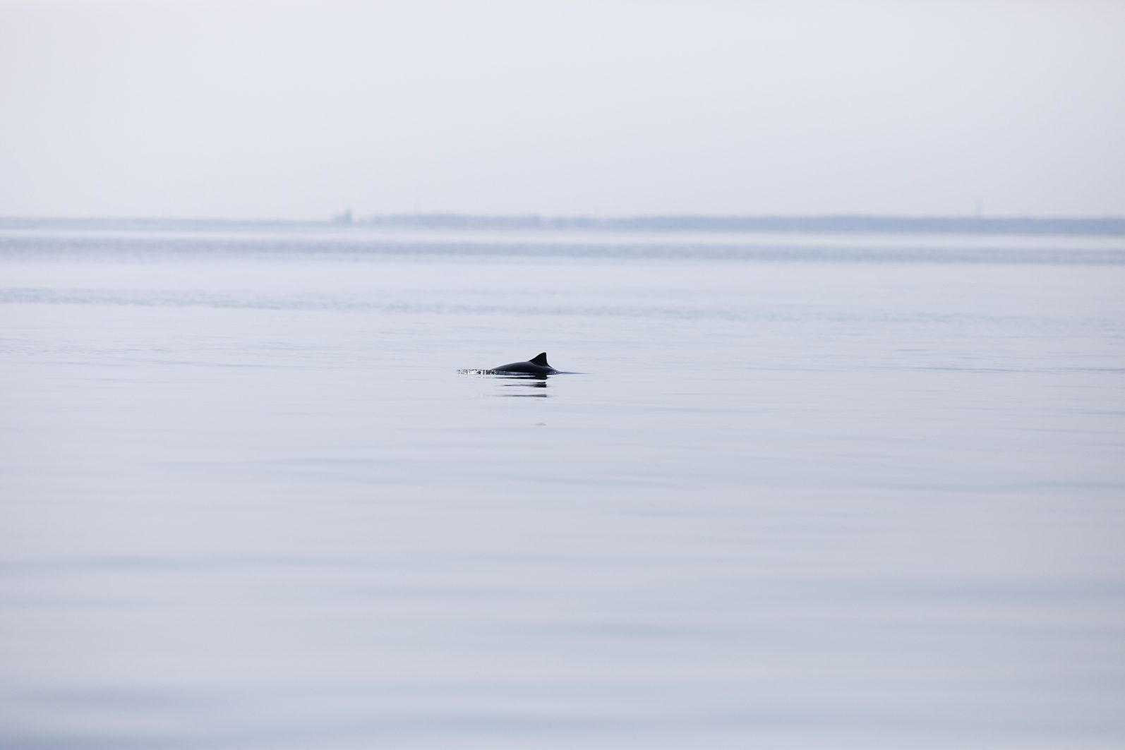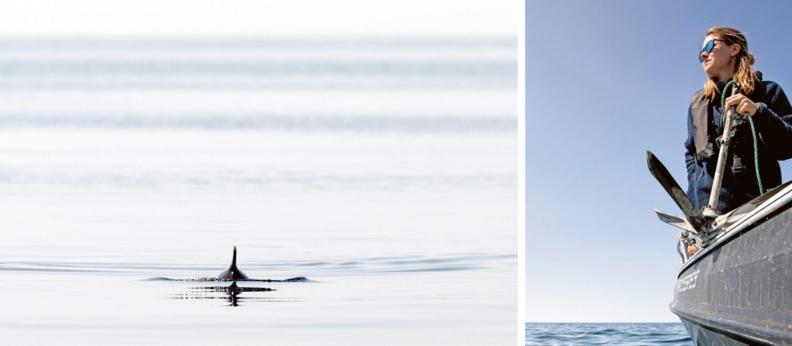 Ett par små fenor bryter den lugna ytan en bit från båten. Två kalvar som simmar tillsammans. Längre ut ser vi ett par fenor till.