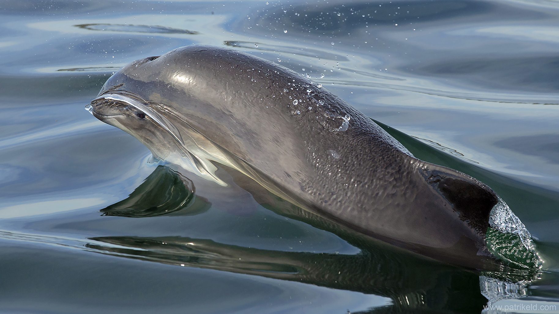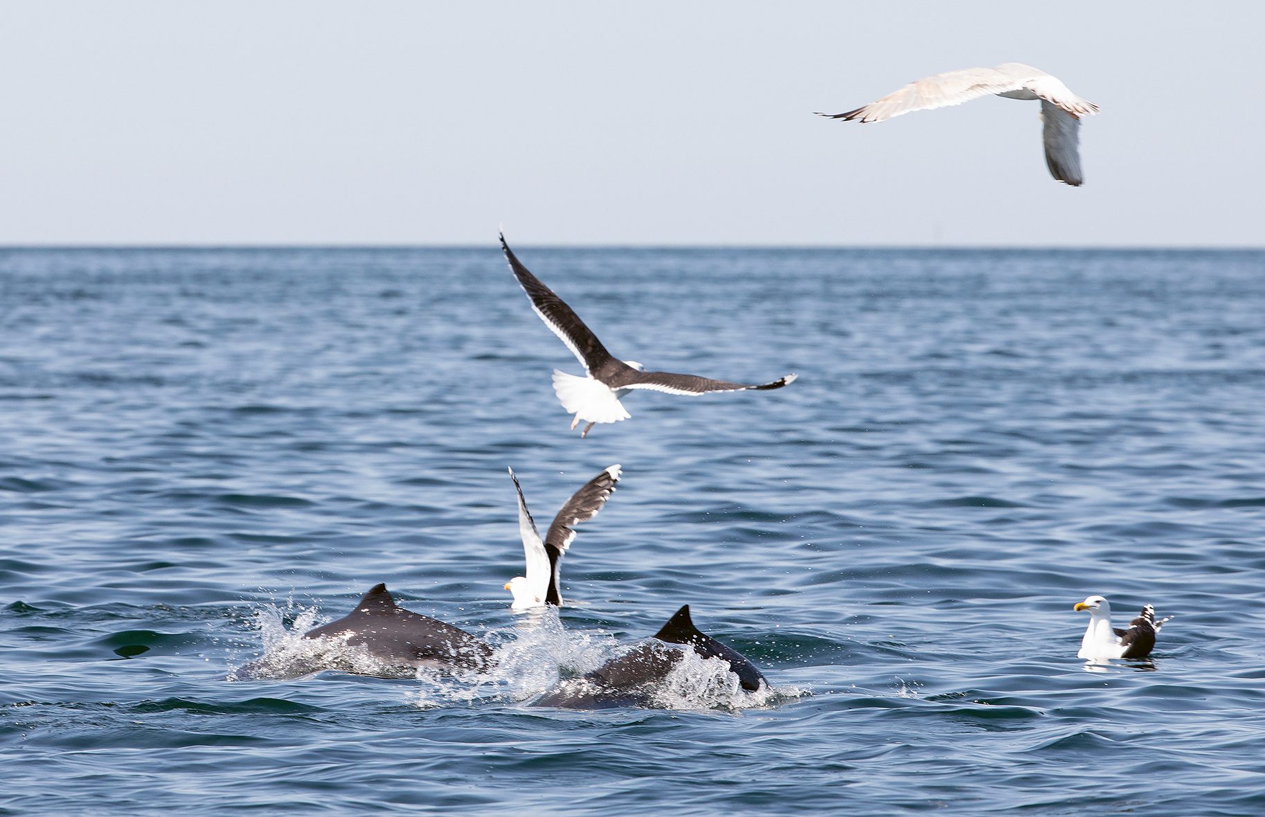 Längre ut till havs ser vi skränande trutar över ett upprört vattenparti. På lite närmare håll syns stänk och mörka blänk i skummet, spolformade kroppar som tycks leka tafatt i mjuka bågrörelser.