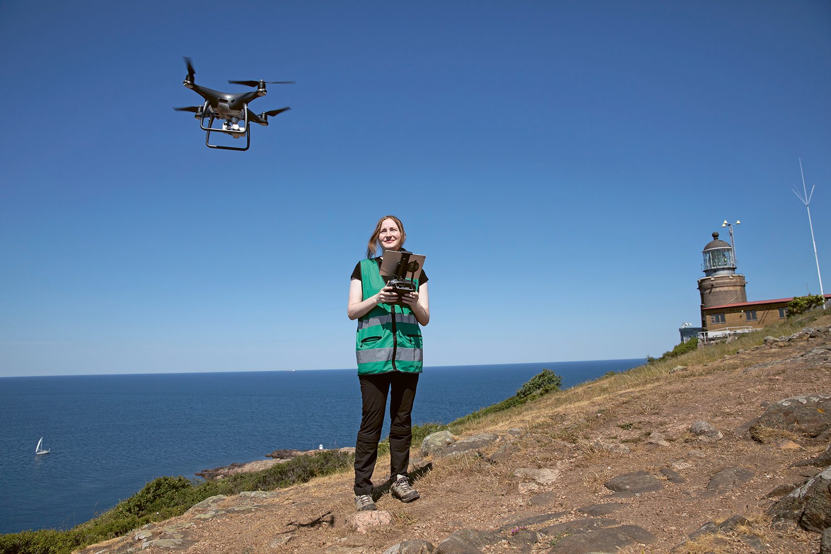 Drönare är ett viktigt redskap även i forskningen vid Kullaberg. Högst uppe på klippan vid fyren, med milsvid utsikt västerut, varvar masterstudenten Dinah Hartmann upp propellrarna på en liten kameraförsedd farkost.
