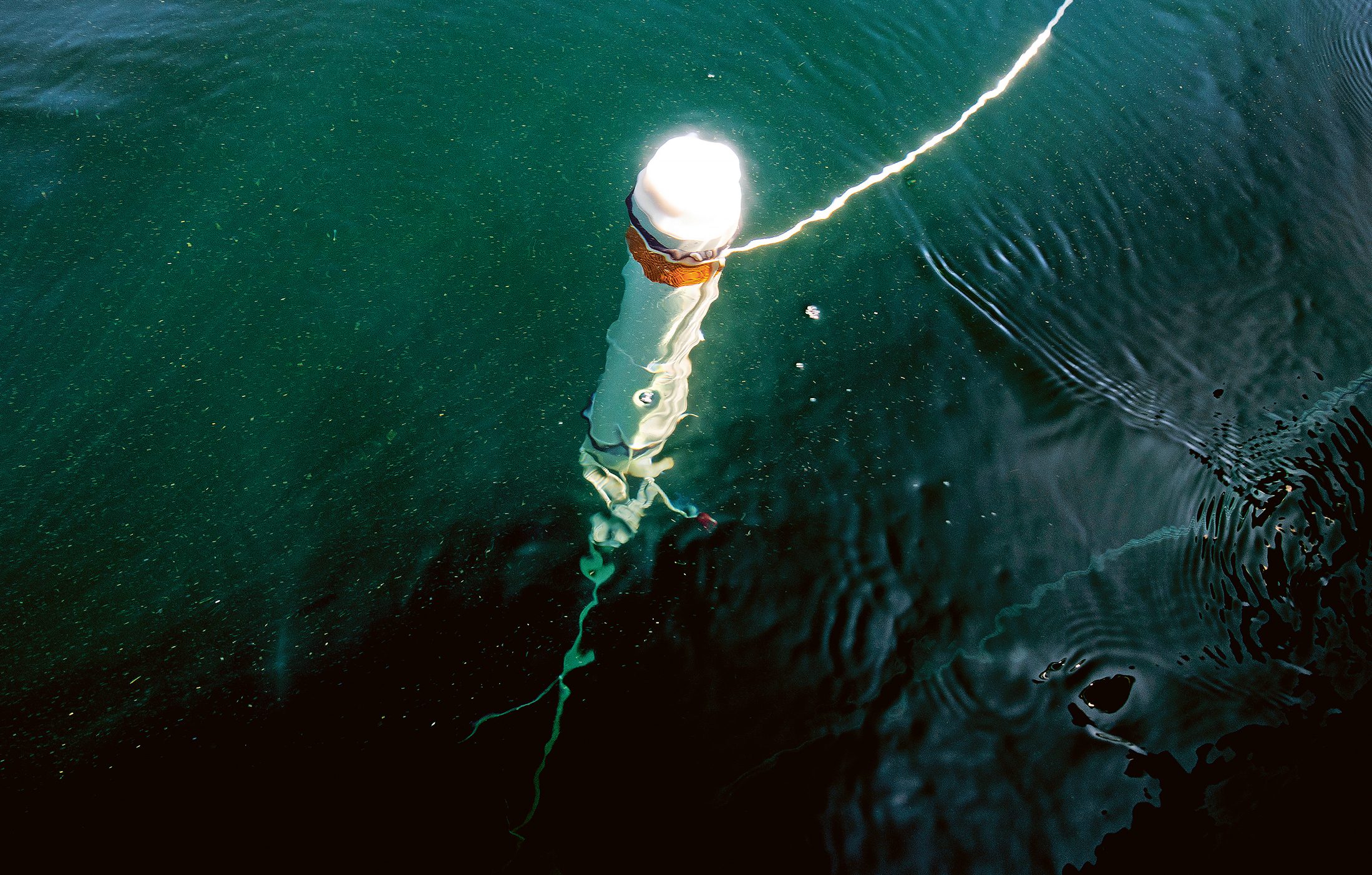 Vi stannar utanför fyrklippan för att sänka ner utrustning på några utvalda ställen. Tumlardetektorerna placeras ut på ungefär 25 meters djup.