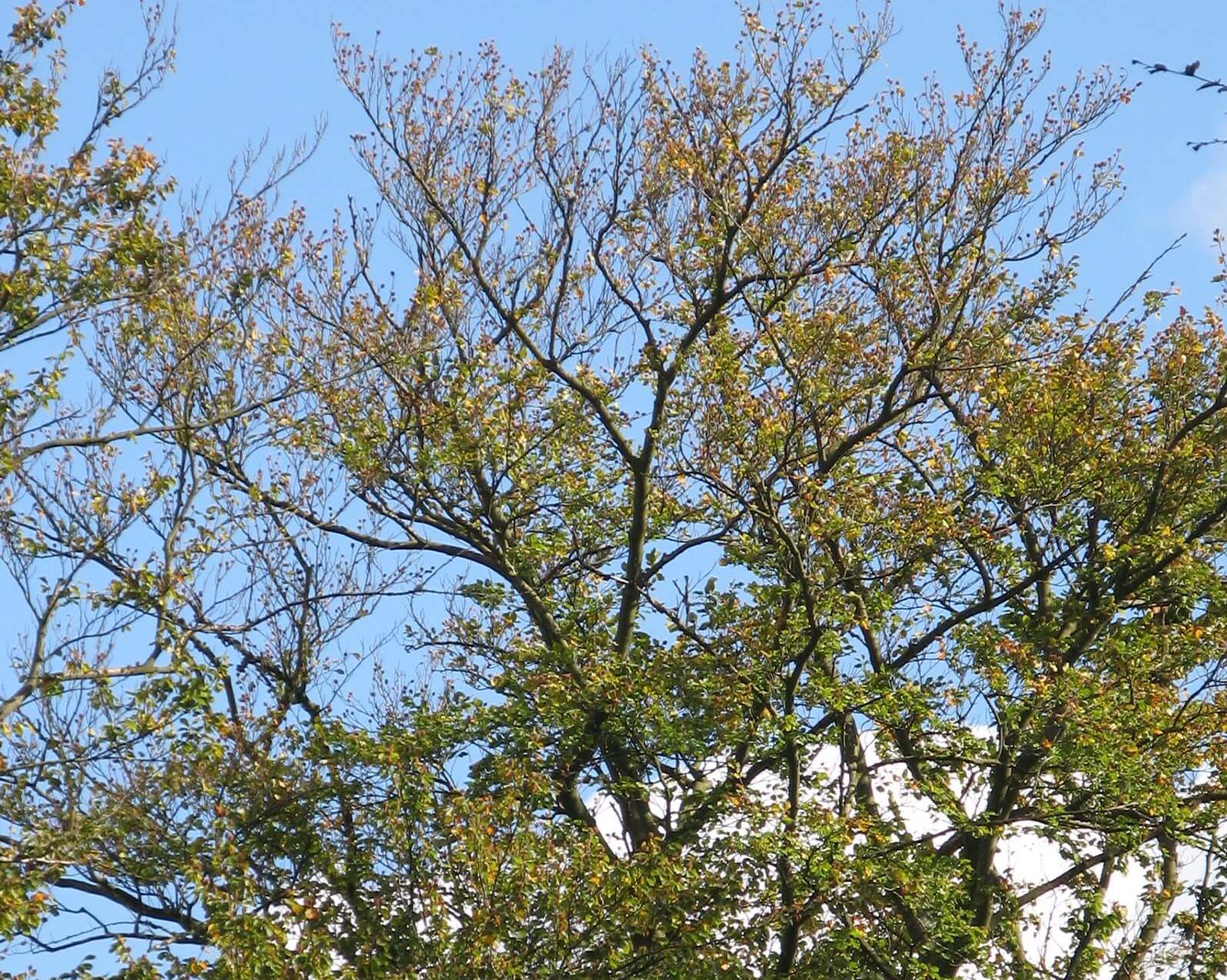 Phytophthora angriper trädens rötter så de inte kan ta upp näring. Det gör att trädkronorna blir glesare. Foto: Johanna Witzell.