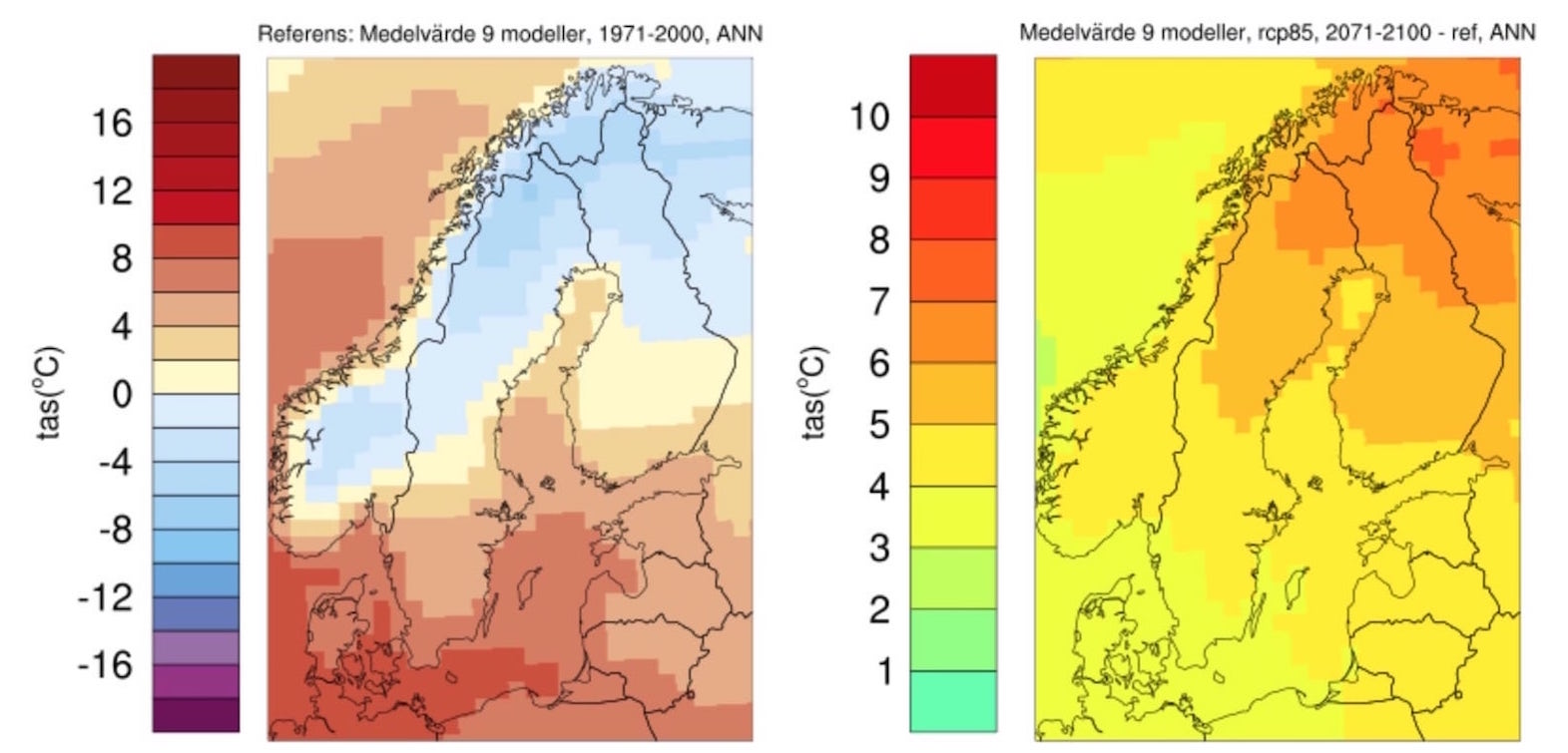 Årsmedeltemperaturen i Sverige ökar. Grafiken visa förändringarna från 1971-2000 (vänster) till 2071-2100 (höger). FOTO: SMHI