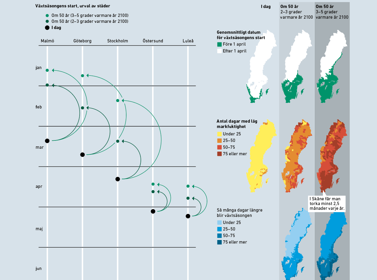 I dag börjar växtsäsongen i mars bara i de allra sydligaste delarna av Sverige. Om 50 år beräknar SMHI:s klimatforskare att denna gräns kommer att ha flyttats rejält norrut i landet – minst i höjd med Gävle men i värsta fall en bra bit längre upp Norrlandskusten