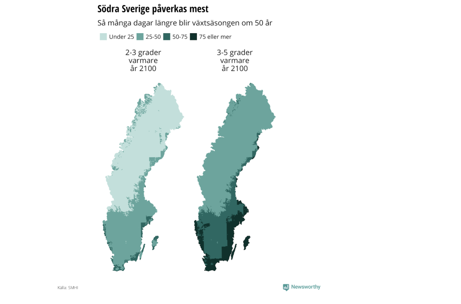 Störst ser effekten ut att bli i de södra delarna av landet, framför allt kustområden, som i det bästa scenariot beräknas få en minst 50 dagar längre växtsäsong än i dag. I värsta fall kan den bli över 75 dagar längre.