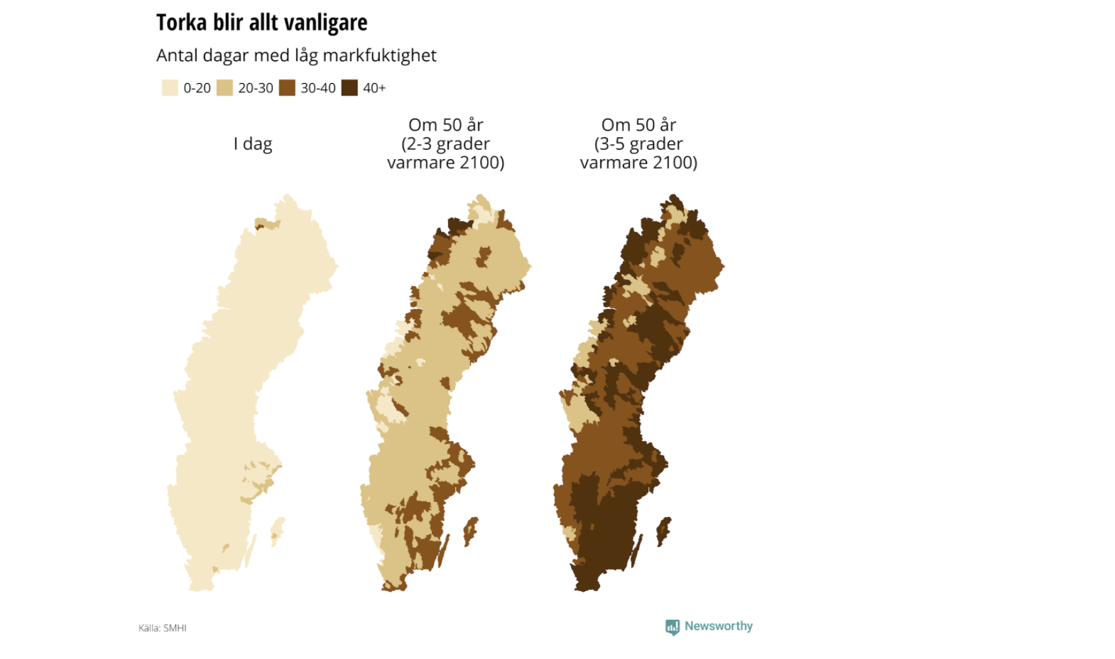 SMHI beräknar att antalet dagar med låg markfuktighet kommer att öka rejält om 50 år. Stockholm, till exempel, beräknas ha mellan 26 och 37 sådana dagar per år, upp från dagens i genomsnitt 17 dagar.
