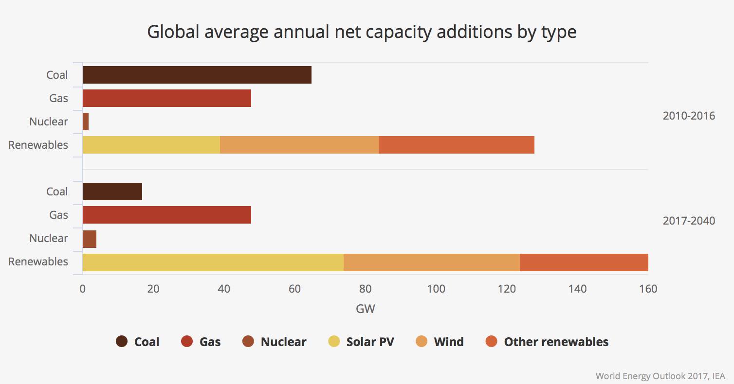Den största efterfrågan står Kina och Indien för. Indien väntas installera lika mycket solenergi som i dag finns i hela EU inom 20 år och Kina motsvarande ett helt USA. I Kina beror efterfrågan på att gamla och ineffektiva kolkraftverk stängs samtidigt som landets ledning vill förbättra luften i städerna. Men omställningen kommer med ett politiskt pris, IEA uppskattar att tre miljoner jobb försvinner i Kinas kolsektor fram till 2040.