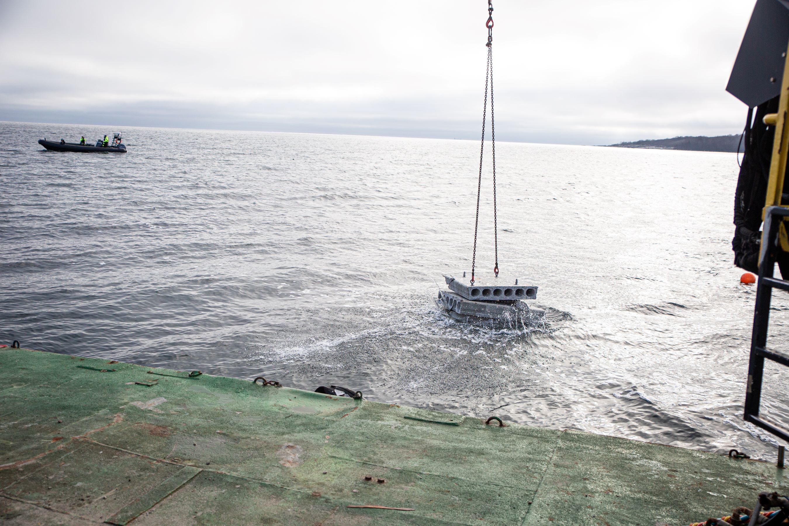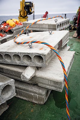 Snart är 15 betongklumpar lastade. På fyra av dem sitter gula bojar i långa rep. Tanken är att se om repen lockar till sig