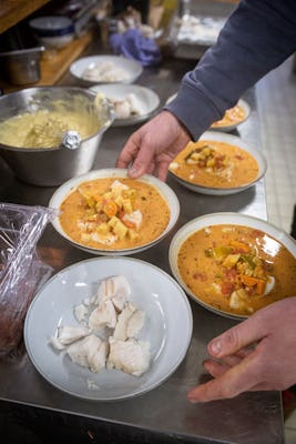 När åtta av reven är lyckligen sjösatta bjuder Hannes på lunch i Hanö hamnkrog som han driver om sommaren. Det var här han träffade Hampus Södergren, som kör dyk-, säl- och fågelskådningsturer, och kom med lunchbeställningar till sina grupper.