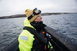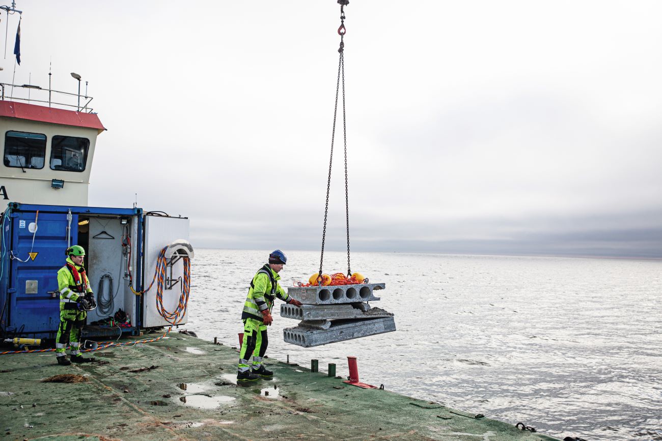 När mätaren visar 19 meter gör Josefine tummen upp. Betongklumparna försvinner långsamt ner i havet.