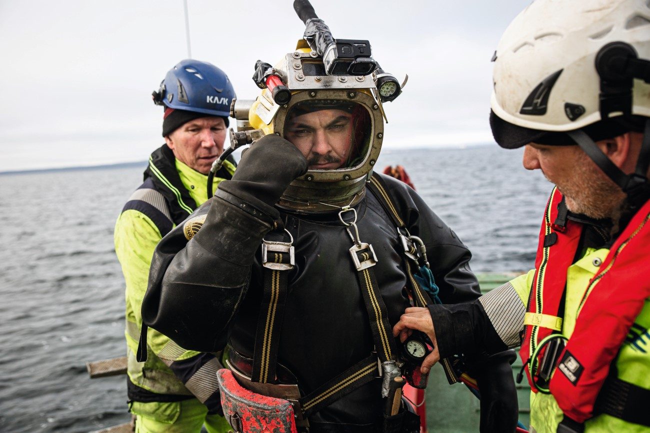 En dykare tar på sig en genomskinlig hjälm som får honom att se ut som en astronaut. Han gör sig redo för att följa första revet till botten och knäppa loss det från kedjorna. Båtens djupmätare visar på 17 meter.