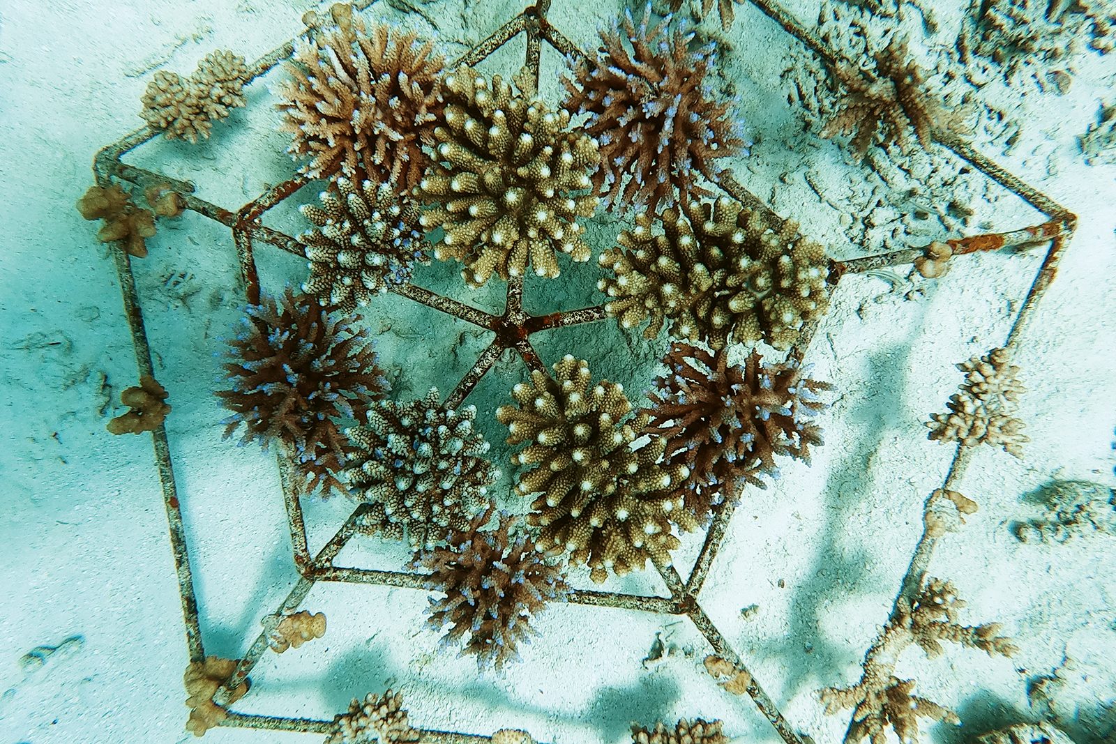Friska korallsticklingar fästs med buntband på galler nära stranden för att växa till sig. När de är redo planteras de ut på djupare vatten igen.