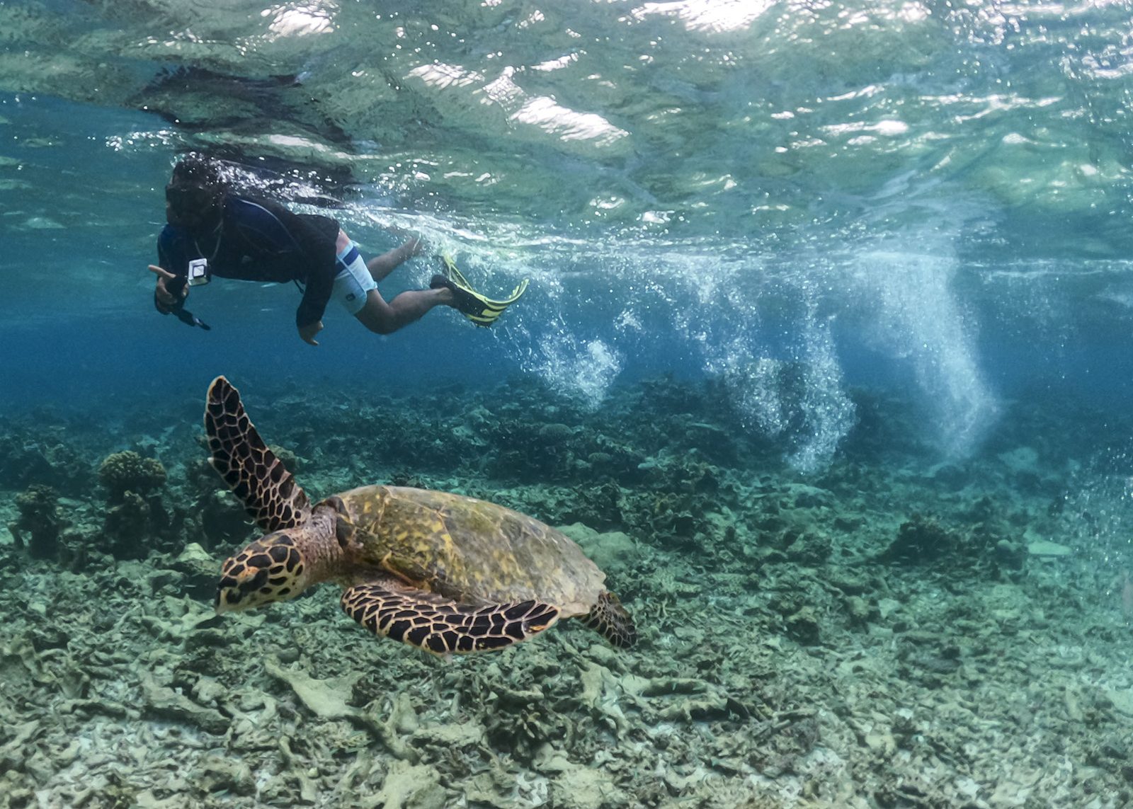 På Maldiverna fick hon arbeta även under ytan med nya utmaningar i svävande partiklar, nyfikna medpassagerare och arbetskläder som fenor och snorkel.