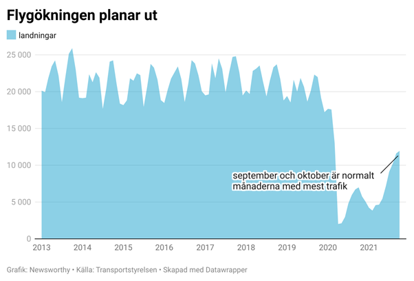 Covid 19-pandemin innebar ett historiskt avbräck för flygandet, både globalt och i Sverige. När flyget tidigare tappat passagerare, i kölvattnet av till exempel 11 september-attackerna, SARS-epidemin och finanskrisen, har den alltid studsat upp till nya rekordnivåer efteråt, men den här gången ser utvecklingen annorlunda ut. Trots att hävda restriktioner, låg antalet flygningar förra månaden fortfarande under hälften av det normala för oktober månad, och ökningen från september vad marginell. September och oktober brukar annars vara två månader med mycket flygtrafik, både räknat i passagerare och antal landningar.