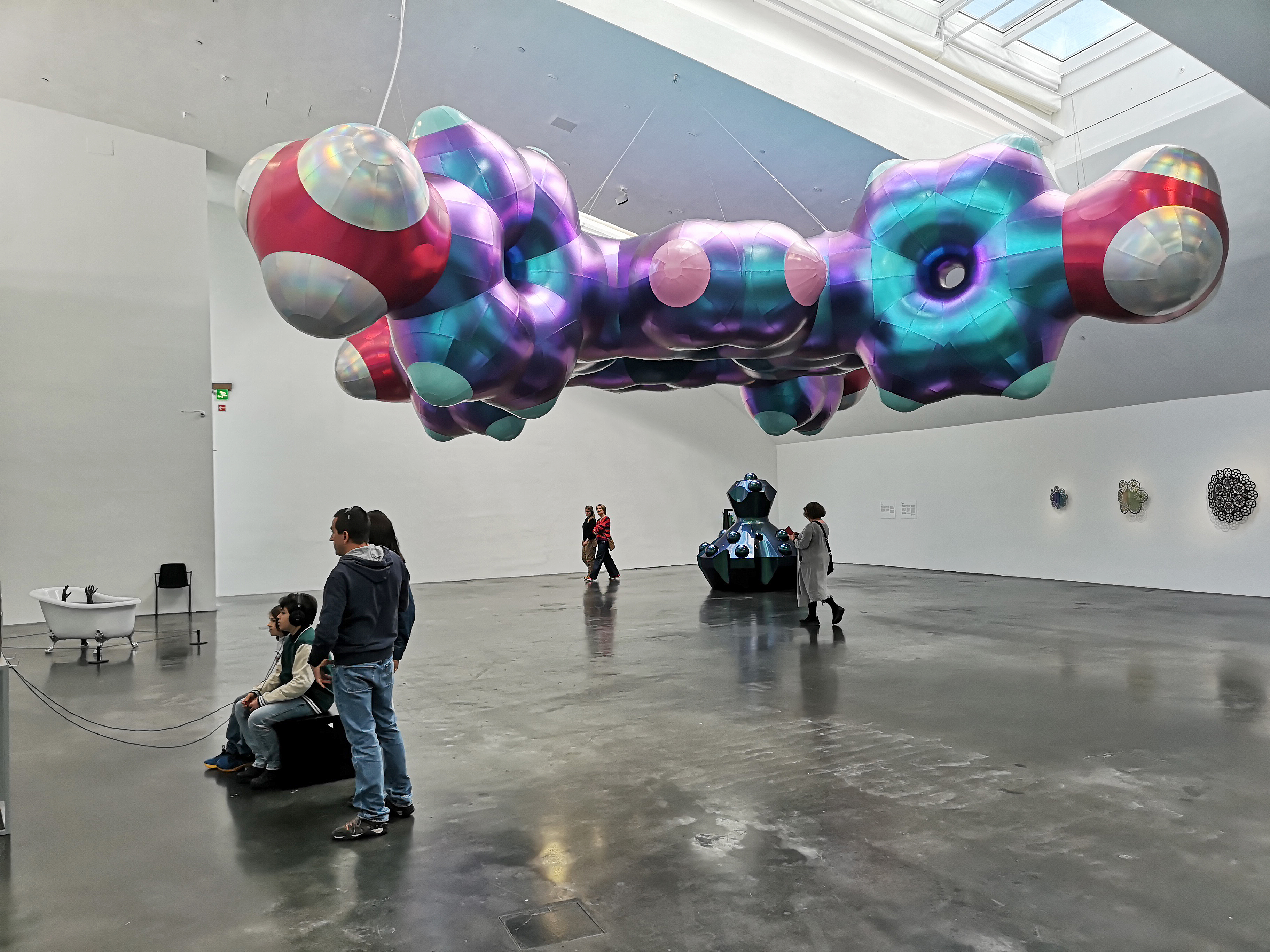 Från taket svävar jättelika färggranna plastmolekyler i Monira Al Qadiris utställning.
