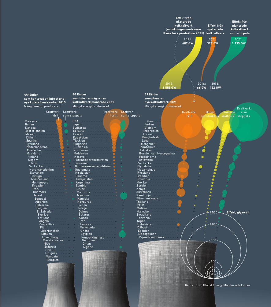 I effekt räknat handlar det om en minskning med mer än tre fjärdedelar. Kina står fortfarande för mer än hälften av den planerade nyproduktionen men lovade under FN:s generalförsamling, i september 2021, att sluta finansiera nya kolkraftverk utomlands.